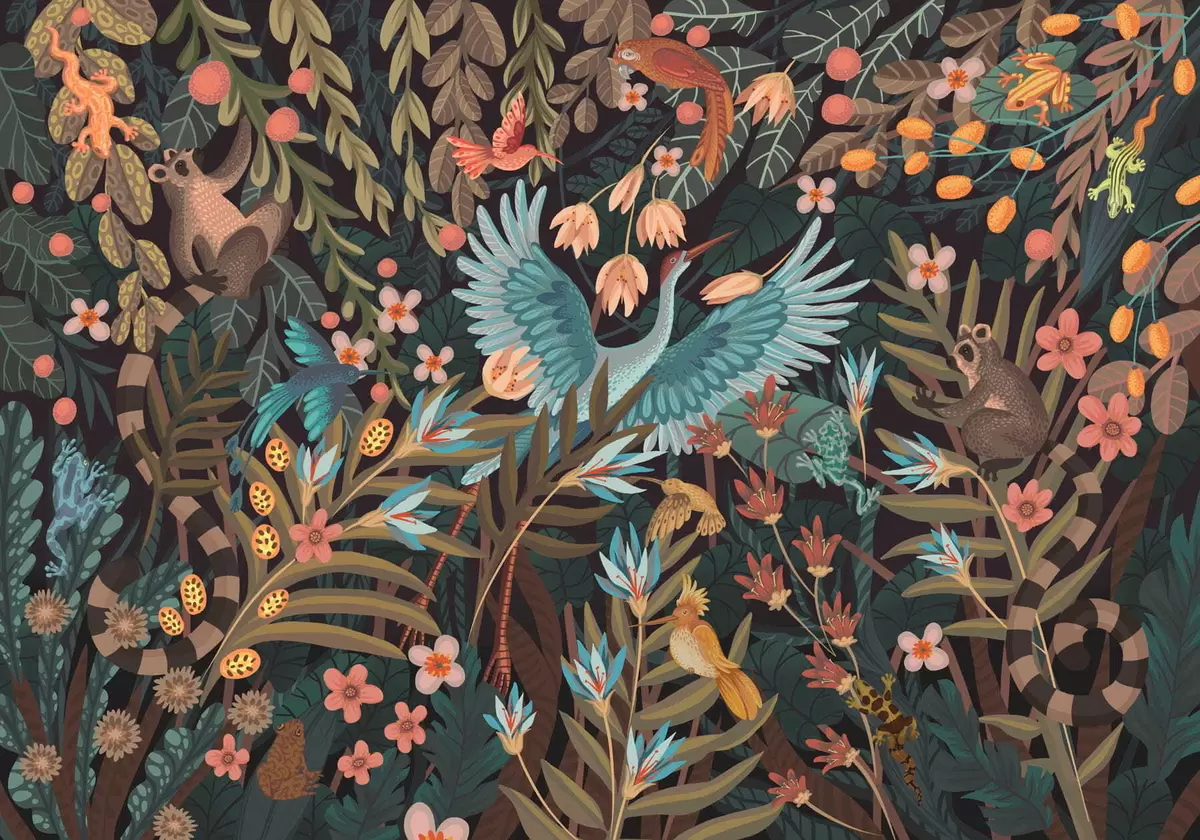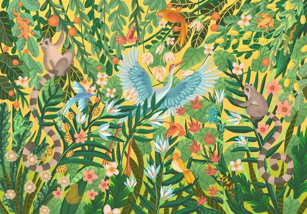 Zidne murale Fantazijski prizor s pticama i životinjama među biljkama br. w05024