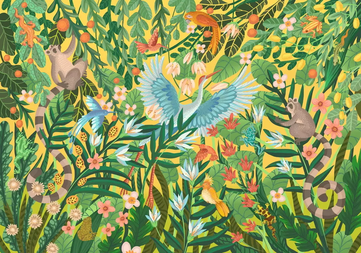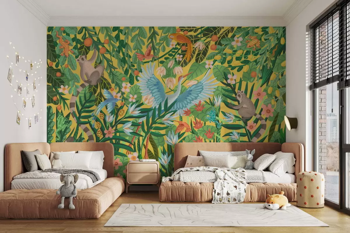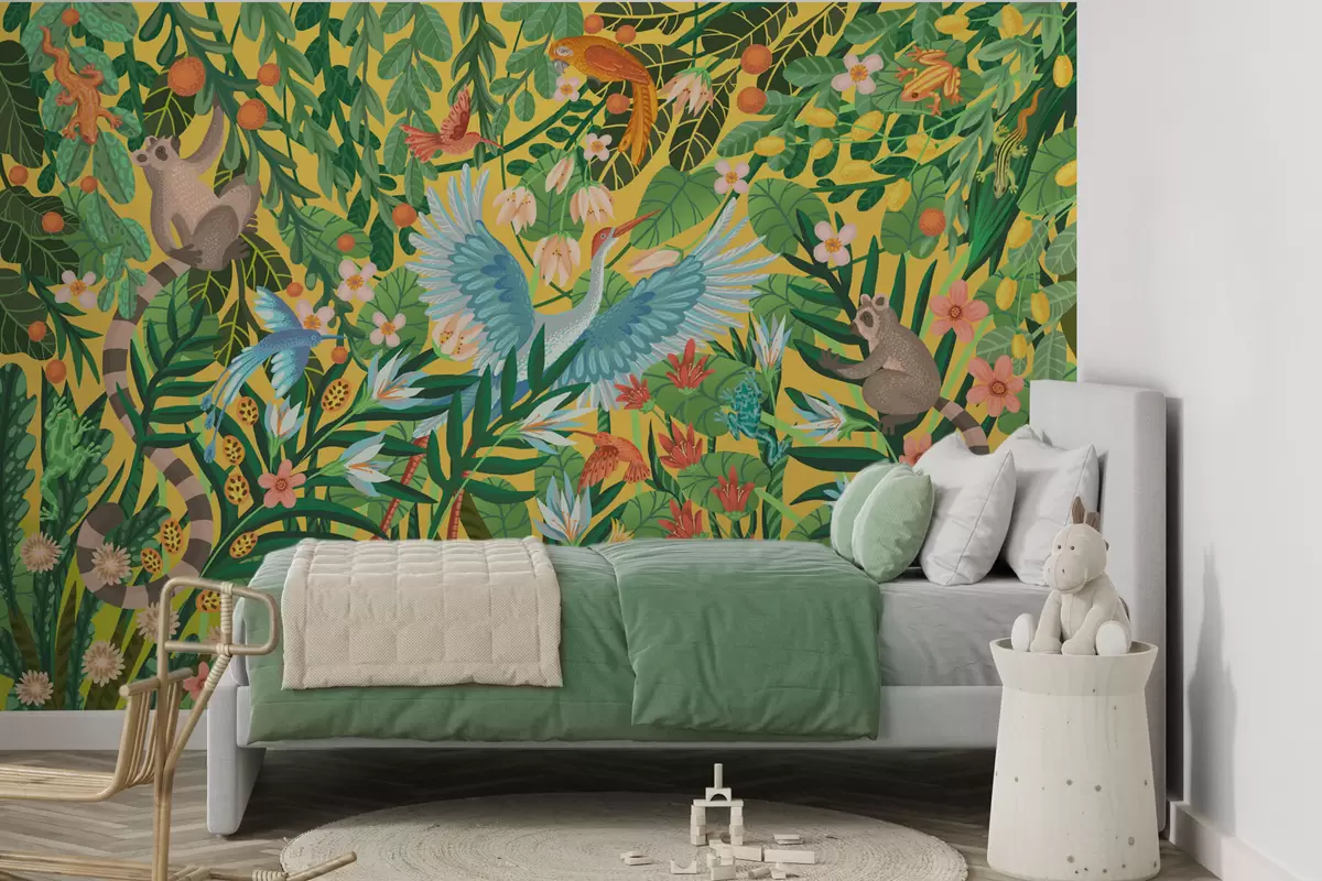 Zidne murale Svijetli prizor s pticama i životinjama u gustom zelenilu br. w05024v1