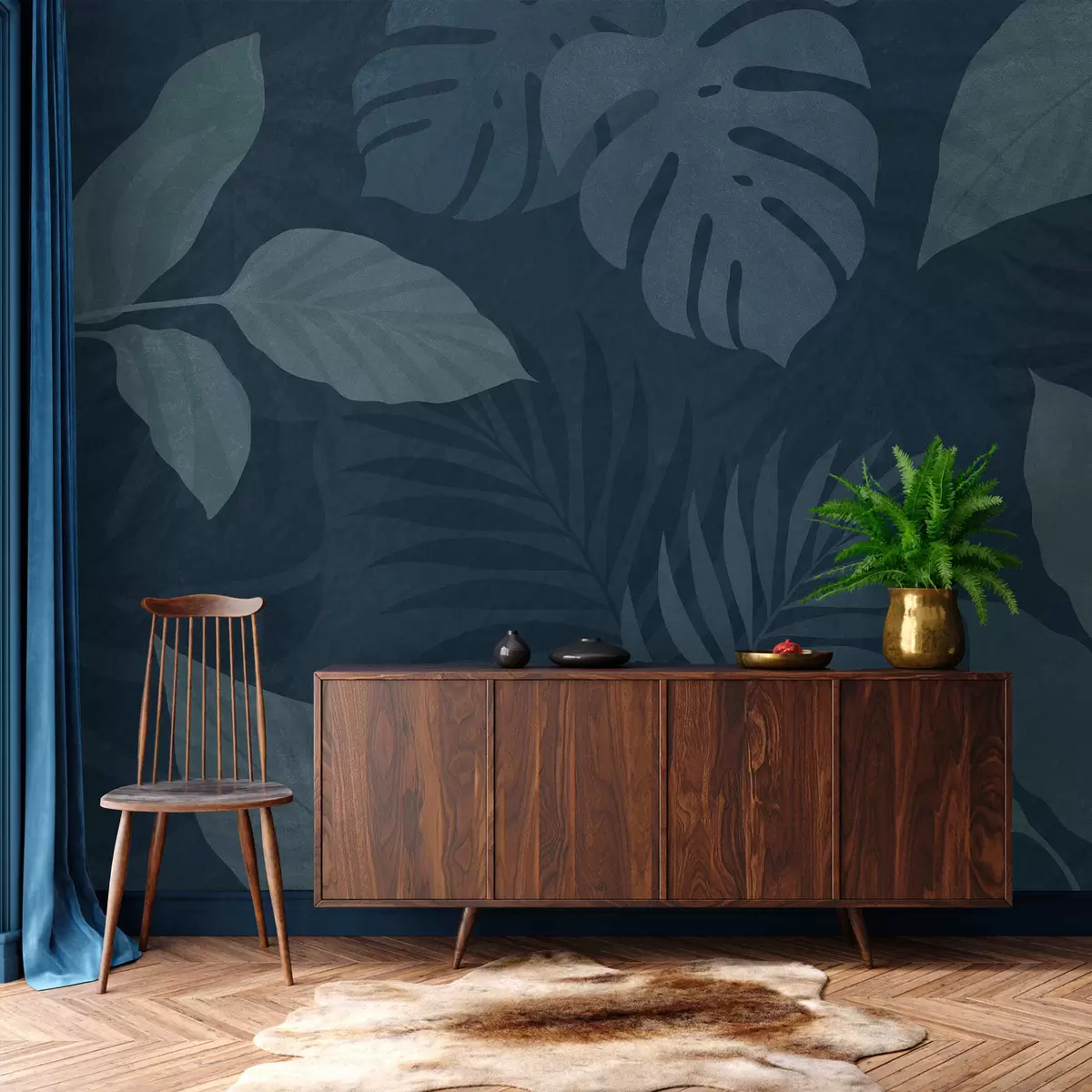 Zidne murale teksturirano tropsko lišće na tamnoplavoj pozadini br. w05063v3