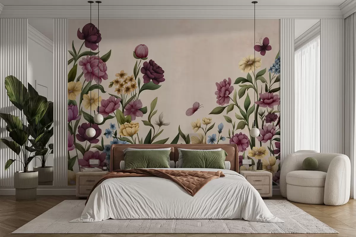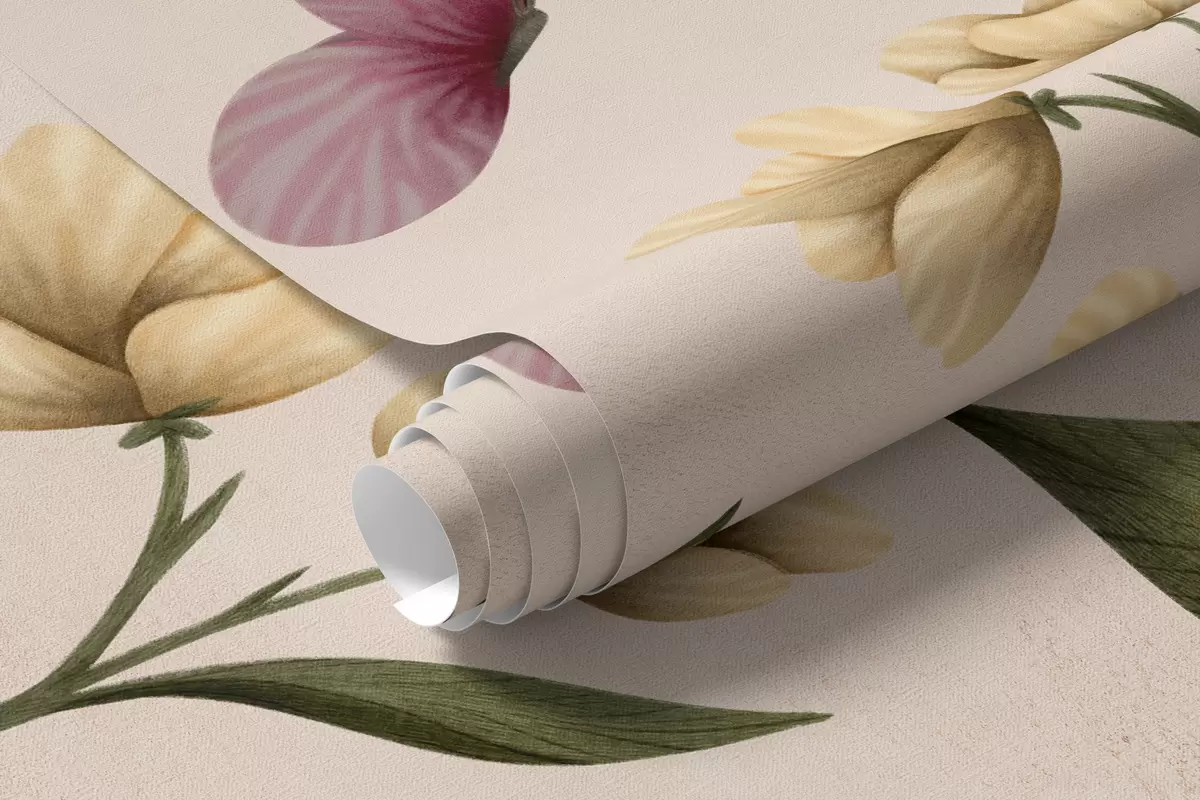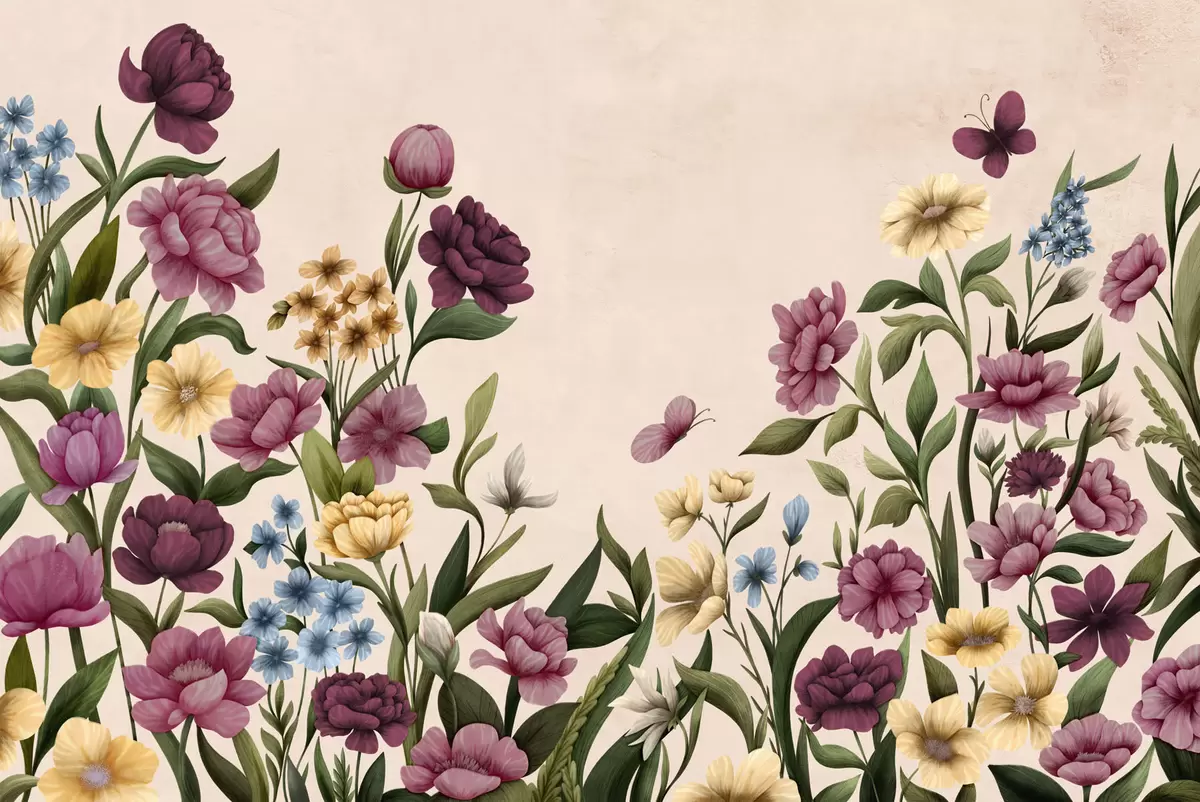 Zidne murale Cvjetna kompozicija s biljkama i leptirima na svijetloj pozadini br. w05072