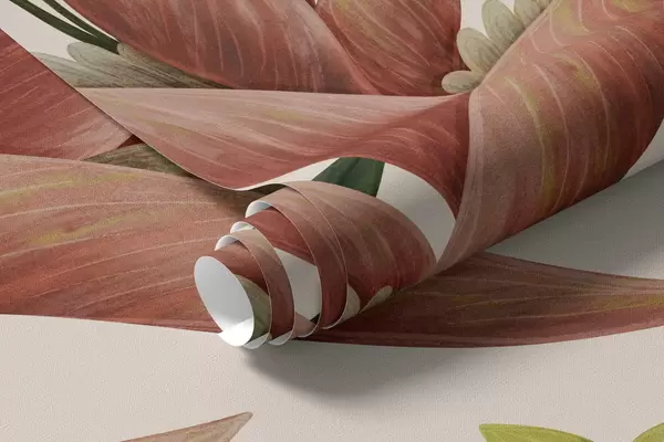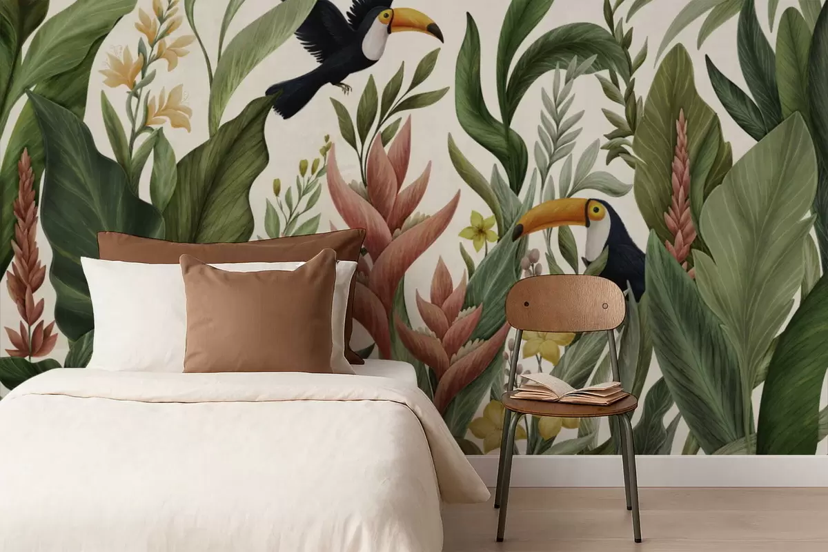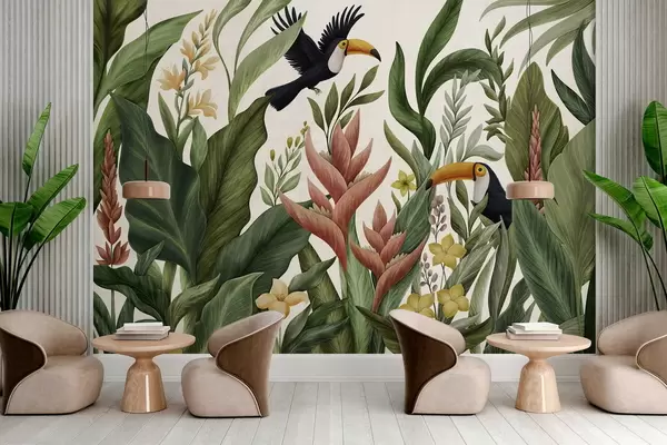 Zidne murale Tropske biljke i ptice s velikim kljunom na svijetloj pozadini br. w05088v1