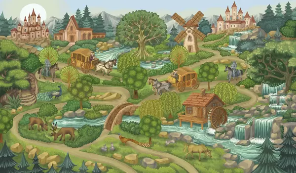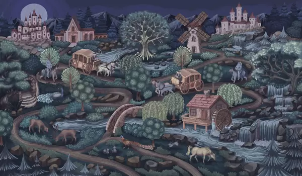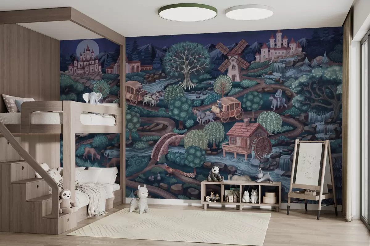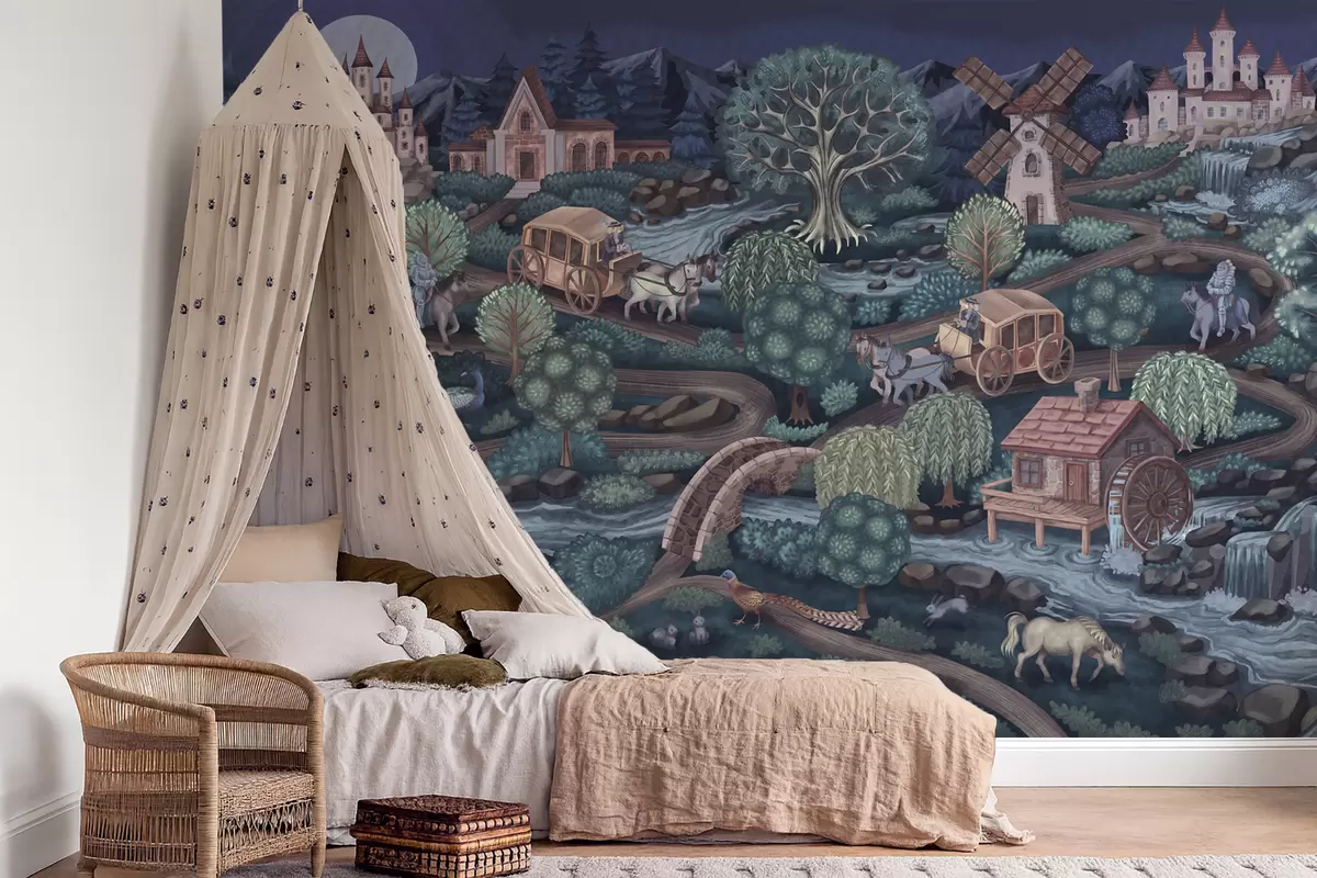 Zidne murale Noćna vila s dvorcima, mlinovima i šumom br. w05091