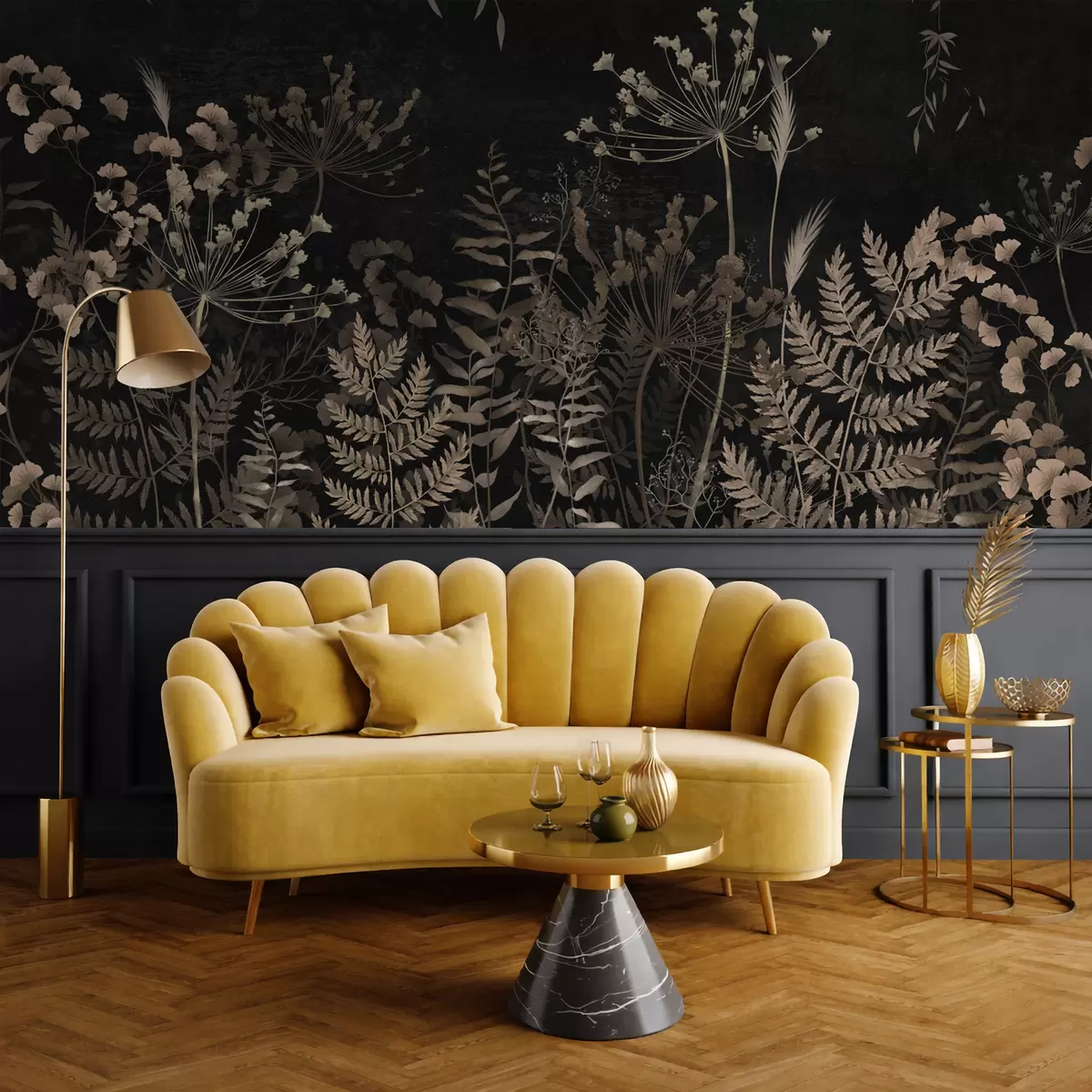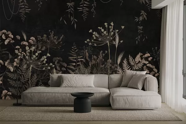 Zidne murale Tamni botanički uzorak s cvijećem i lišćem br. w05092