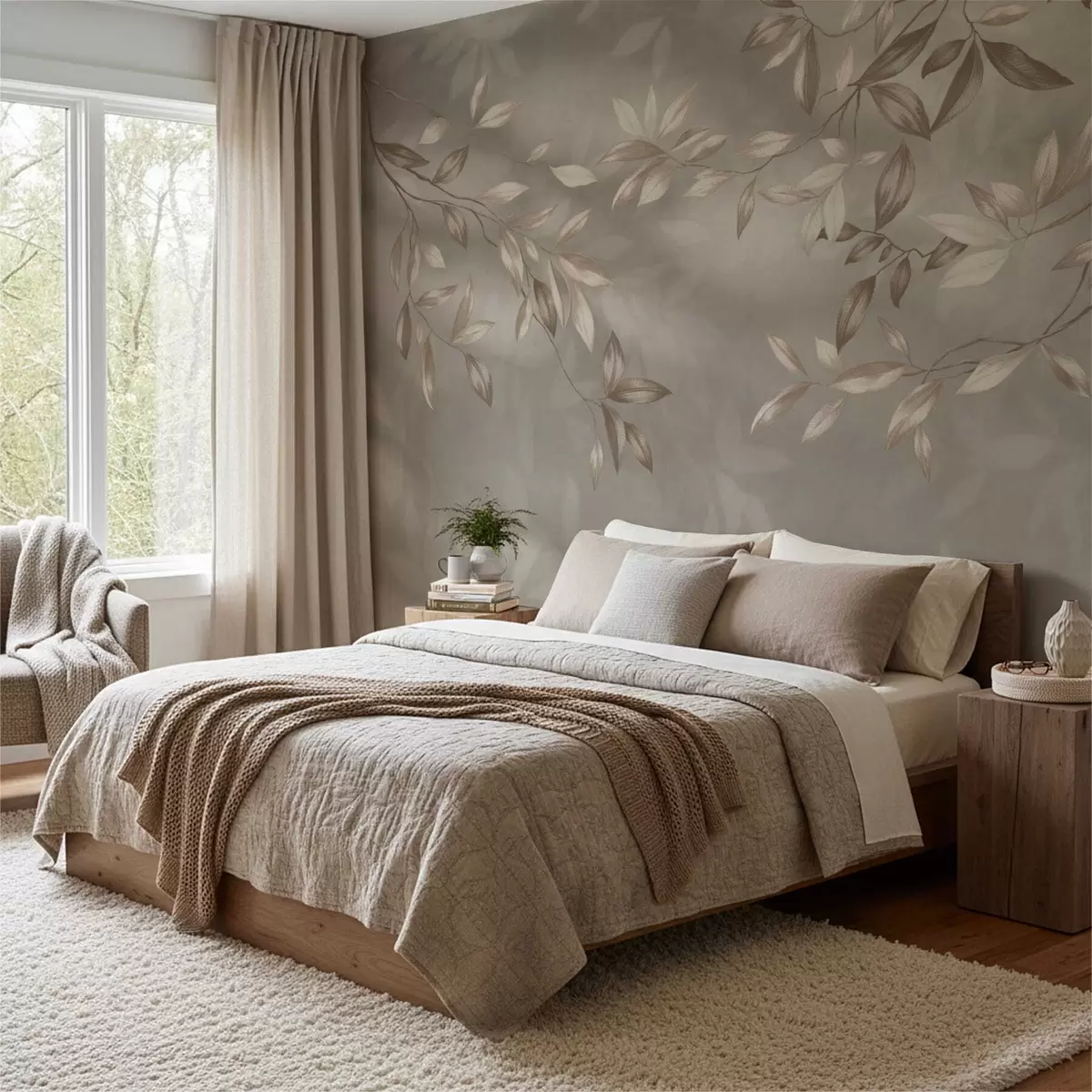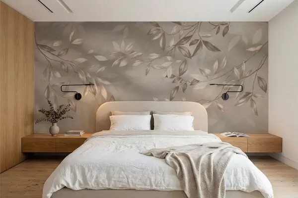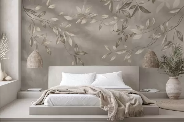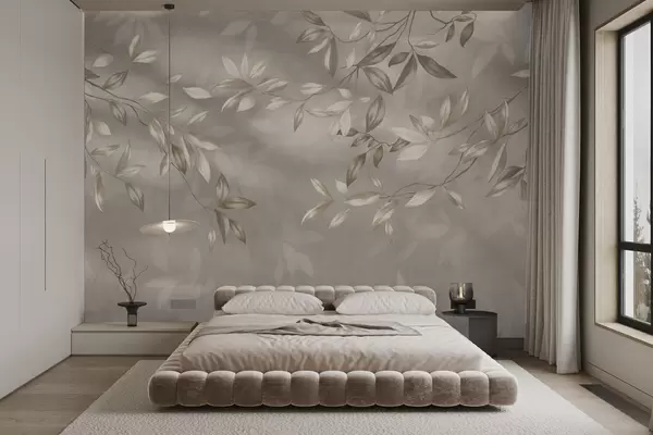 Zidne murale Elegantne lisnate grane u bež nijansama na svijetloj pozadini br. w05113