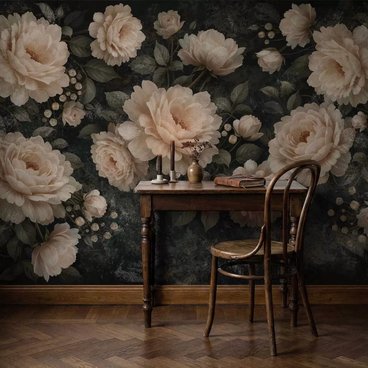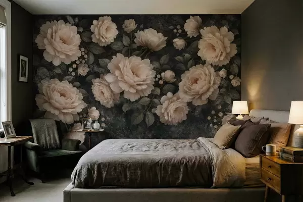 Zidne murale Voluminozno cvijeće u bež paleti na tamnoj pozadini br. w05114