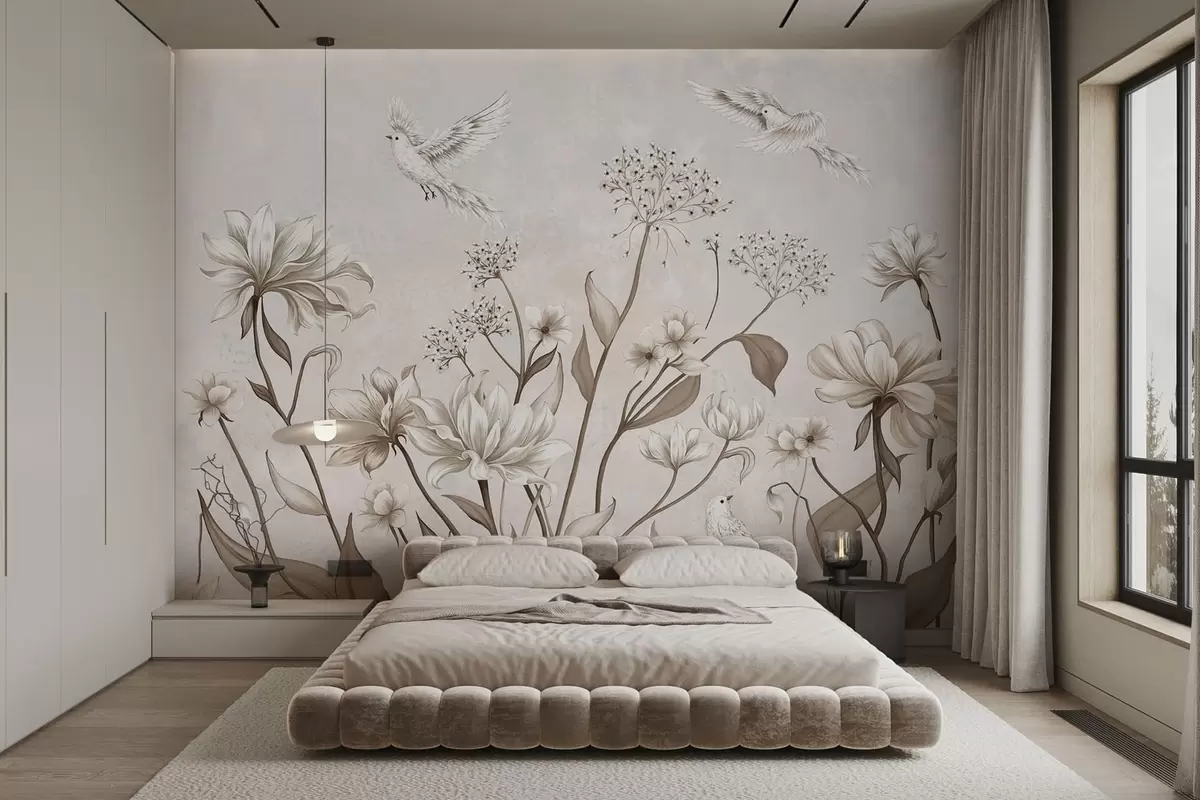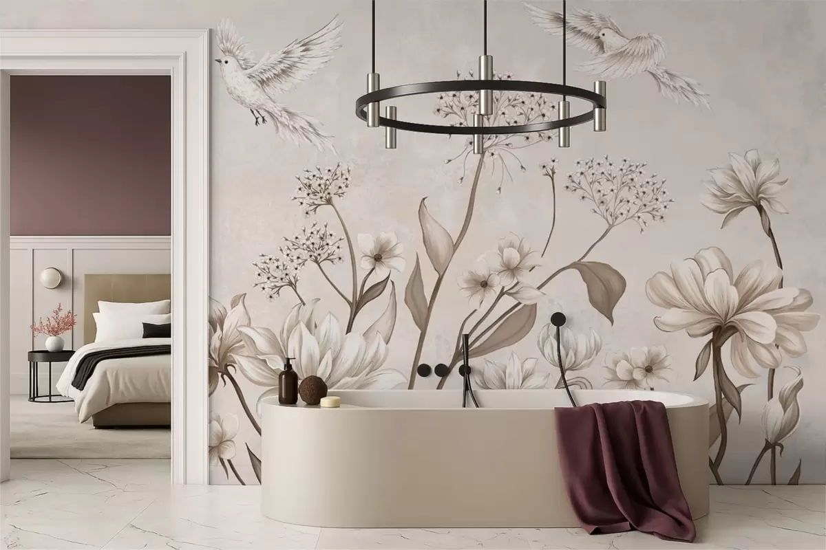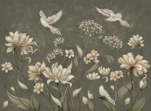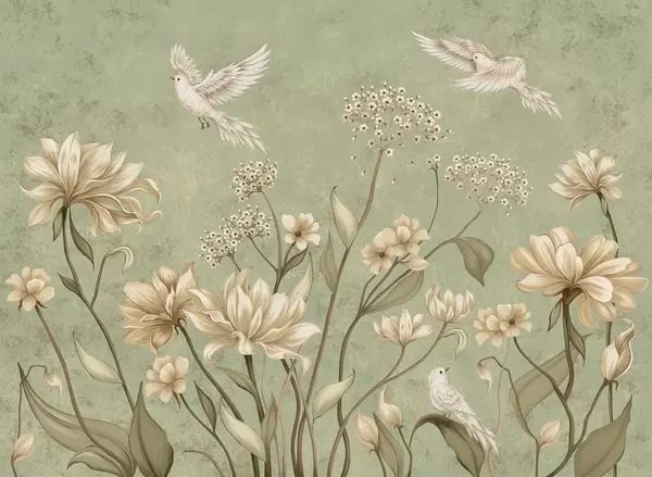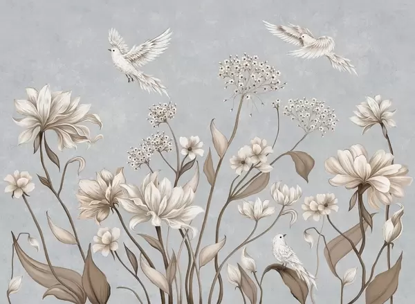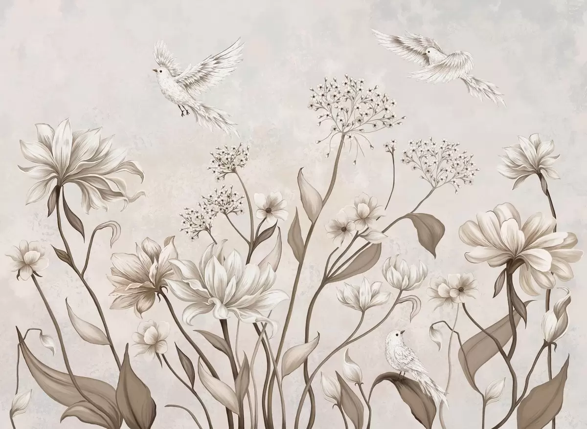 Zidne murale Lagano cvijeće i ptice na mekoj pozadini br. w05118