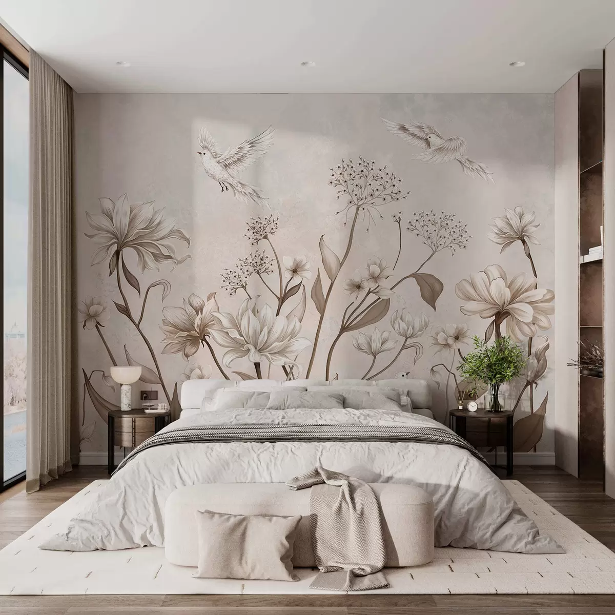 Zidne murale Lagano cvijeće i ptice na mekoj pozadini br. w05118