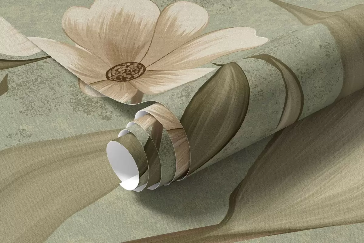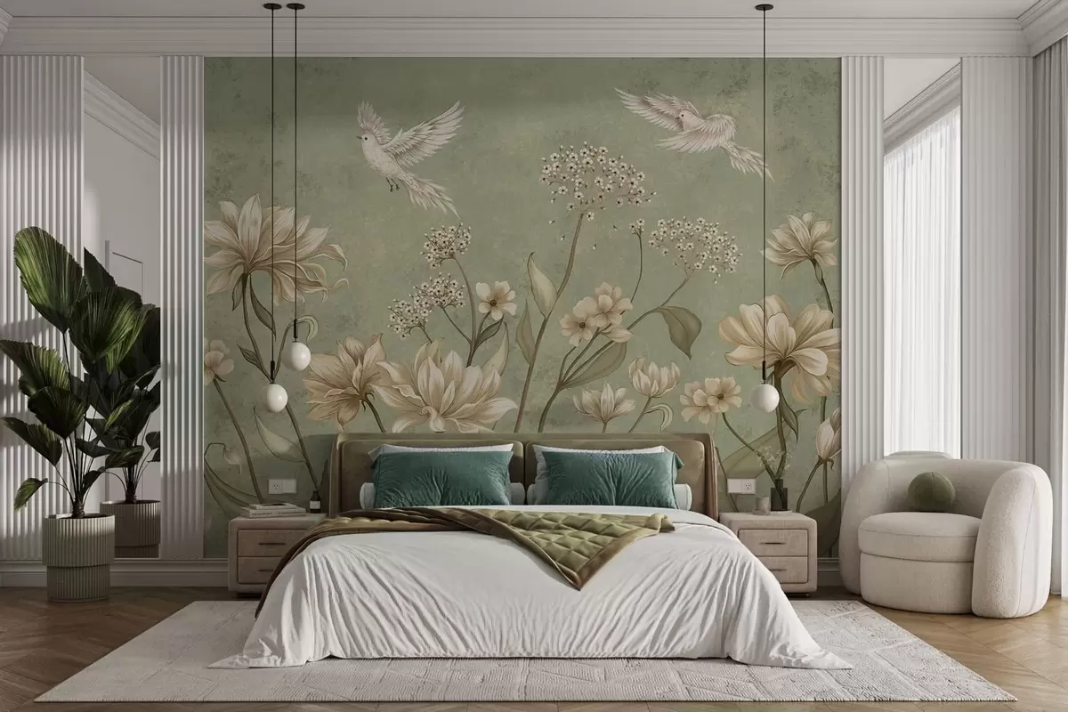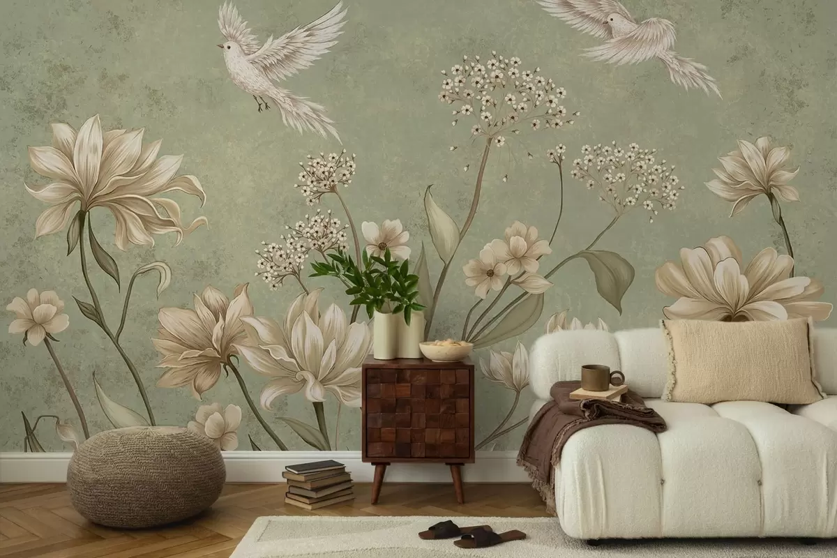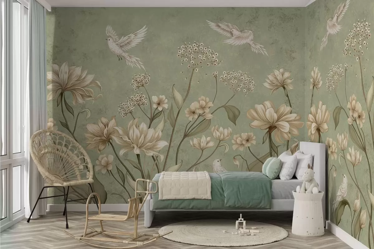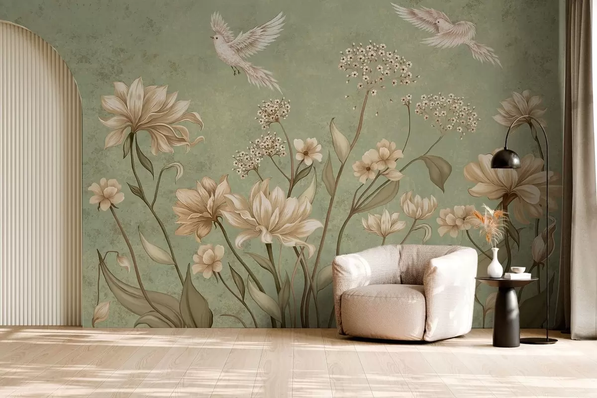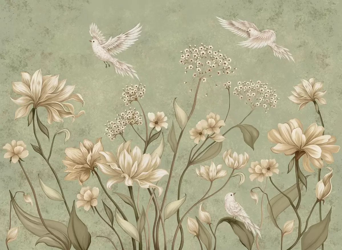 Zidne murale Cvijeće i ptice na zelenoj teksturiranoj pozadini br. w05118v1