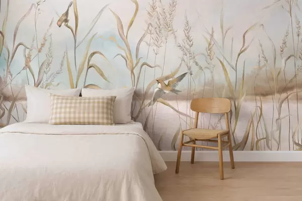 Zidne murale Ilustracija trske i ptica uz vodu u mekim tonovima br. w05125