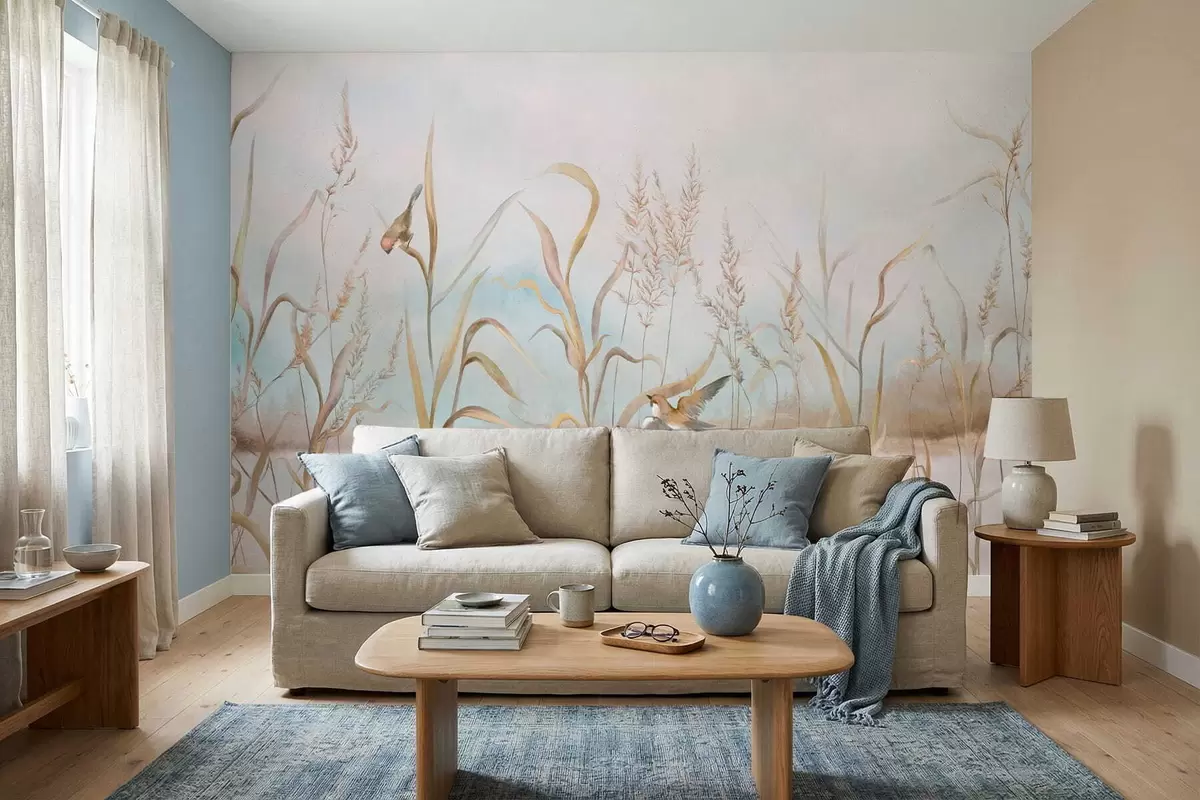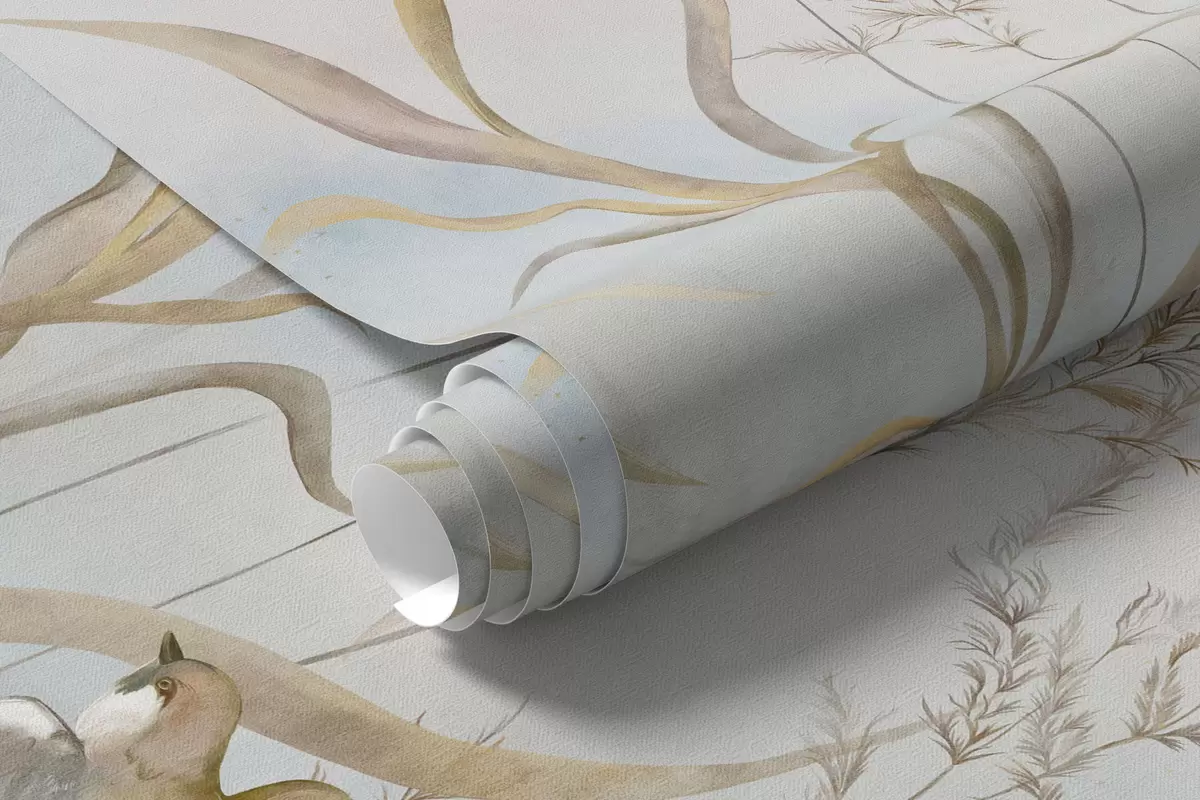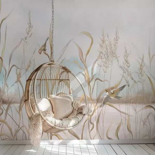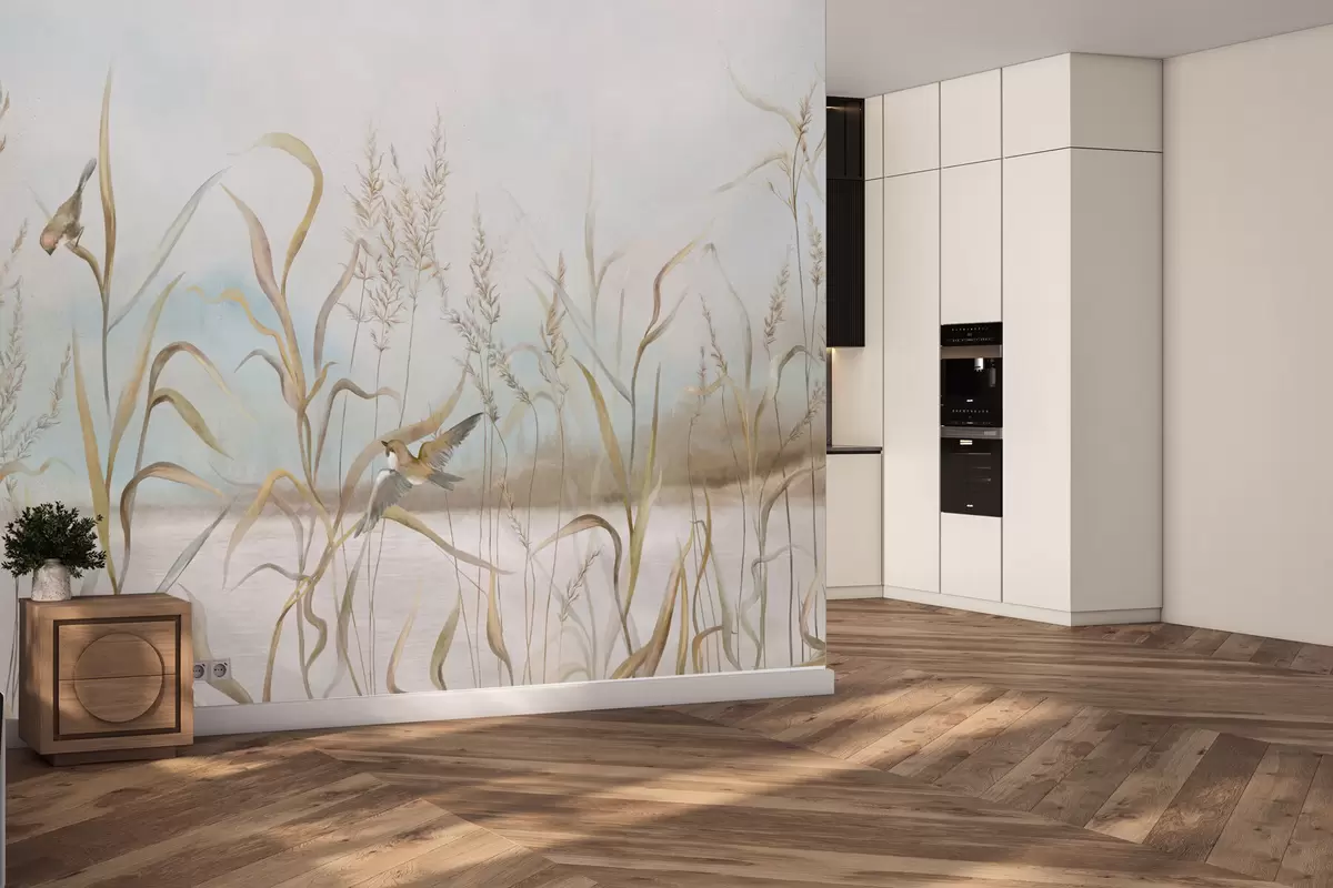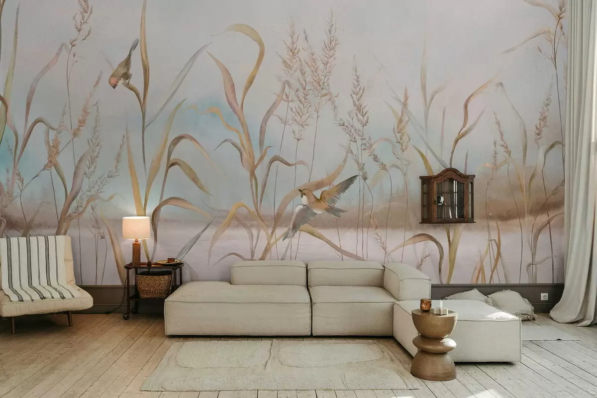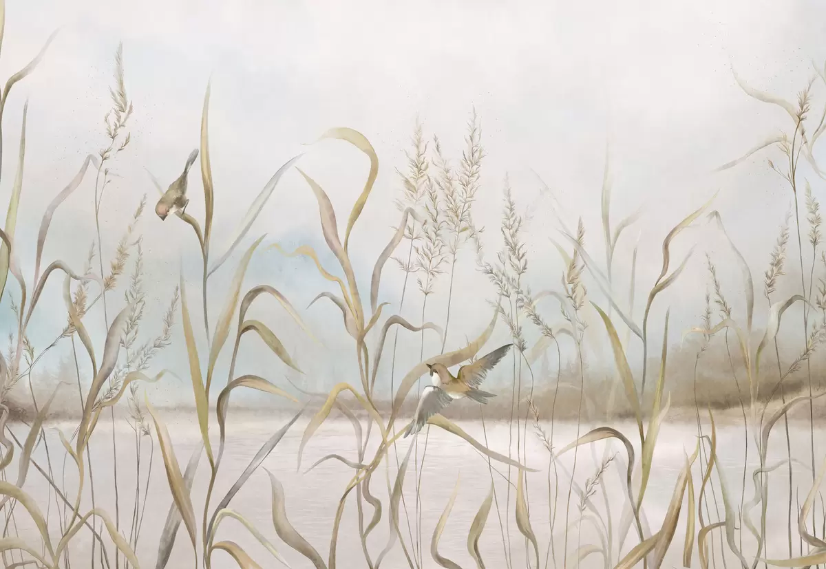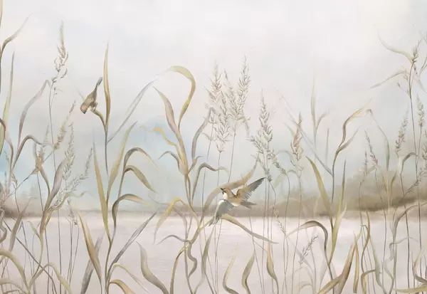 Zidne murale Ilustracija trske i ptica uz vodu u mekim tonovima br. w05125