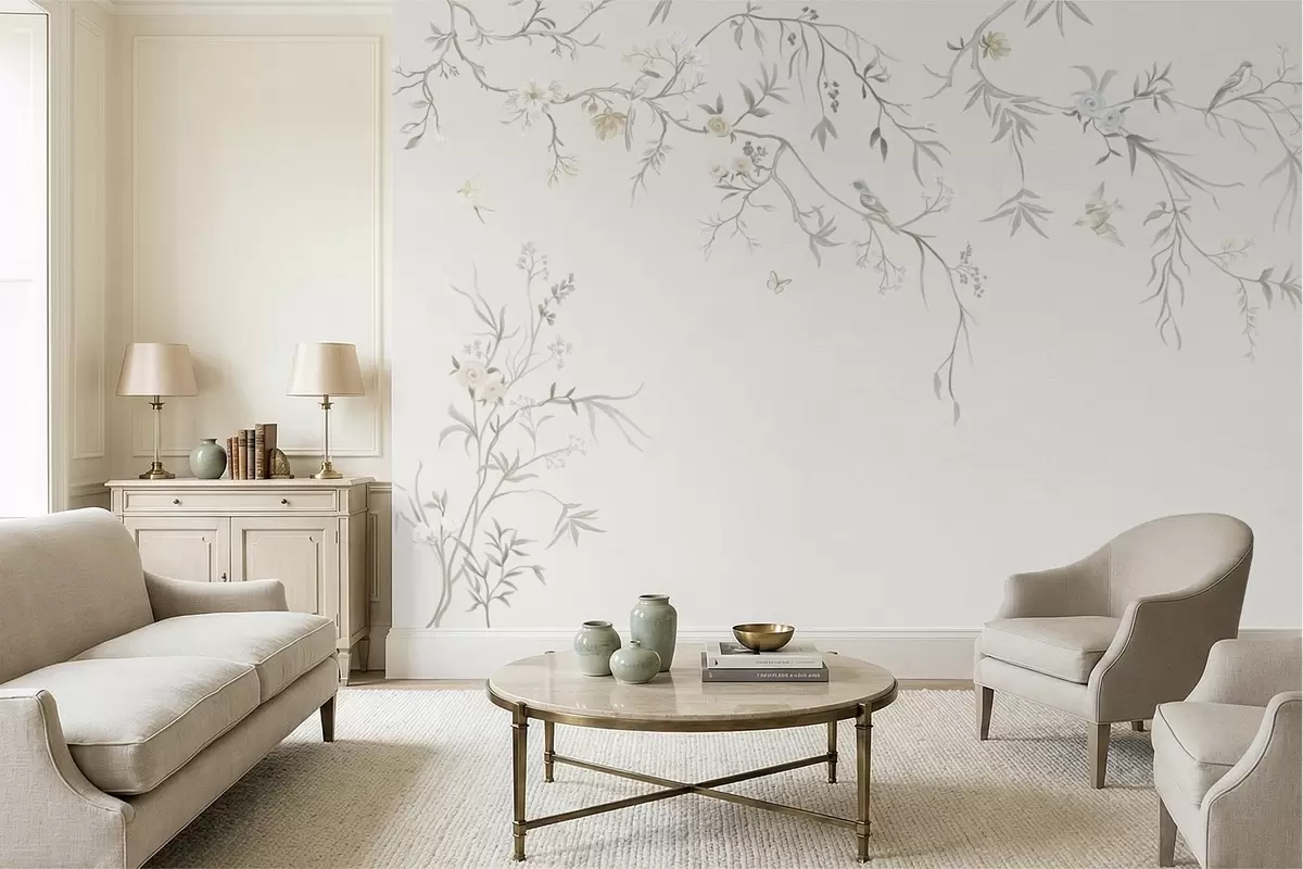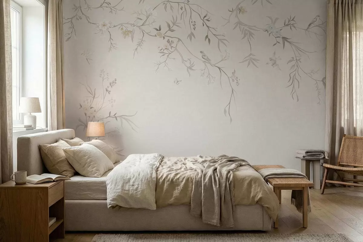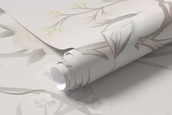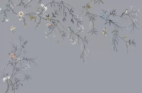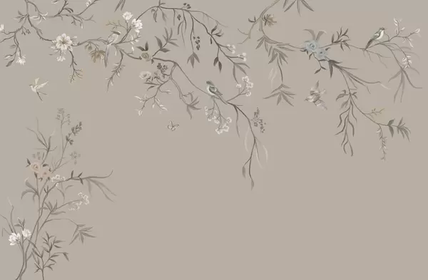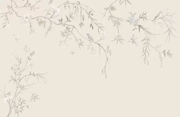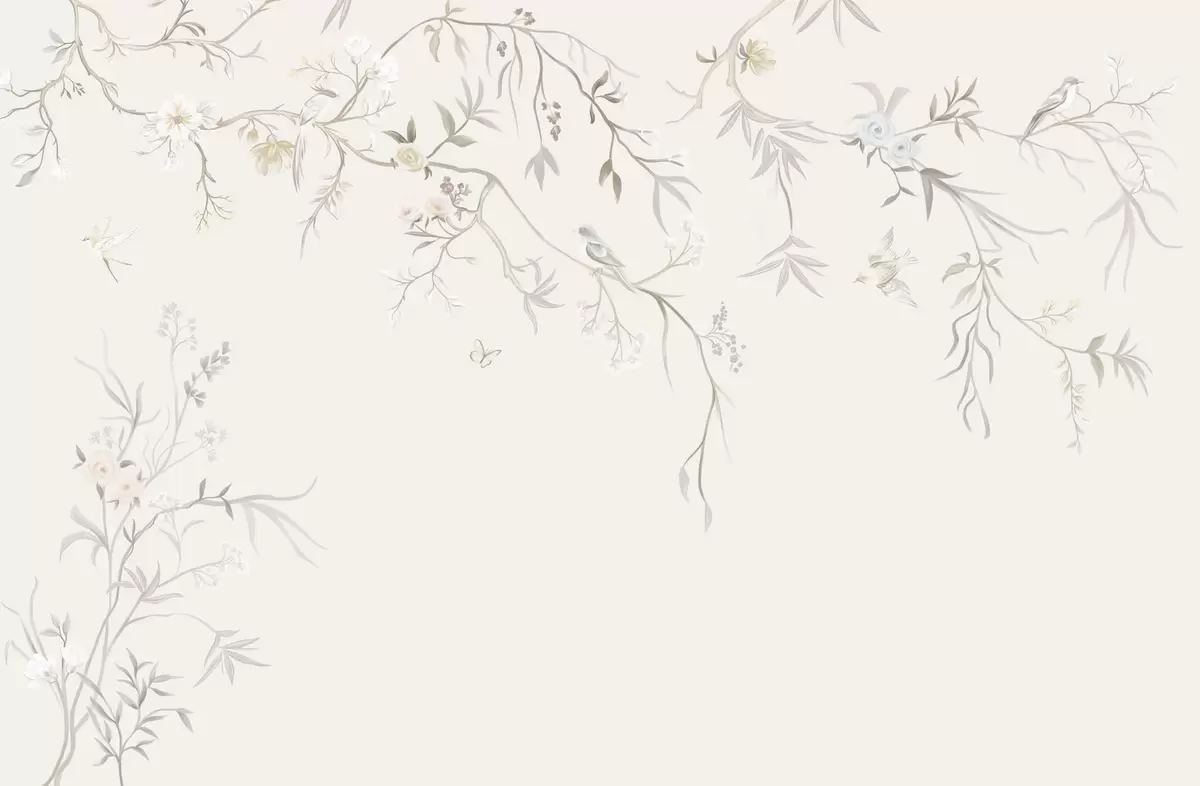 Zidne murale Nježno cvijeće i ptice na kredastoj pozadini br. w05127