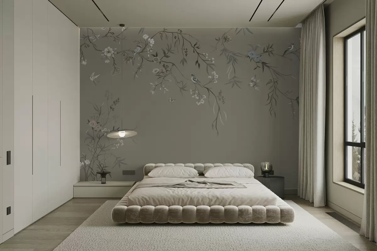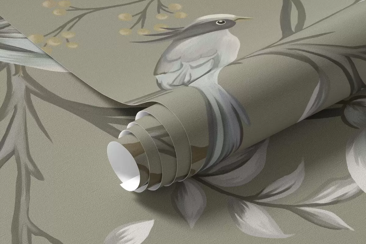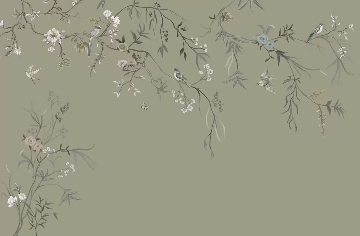 Zidne murale Cvjetni motiv s pticama na sivoj pozadini br. w05127v4