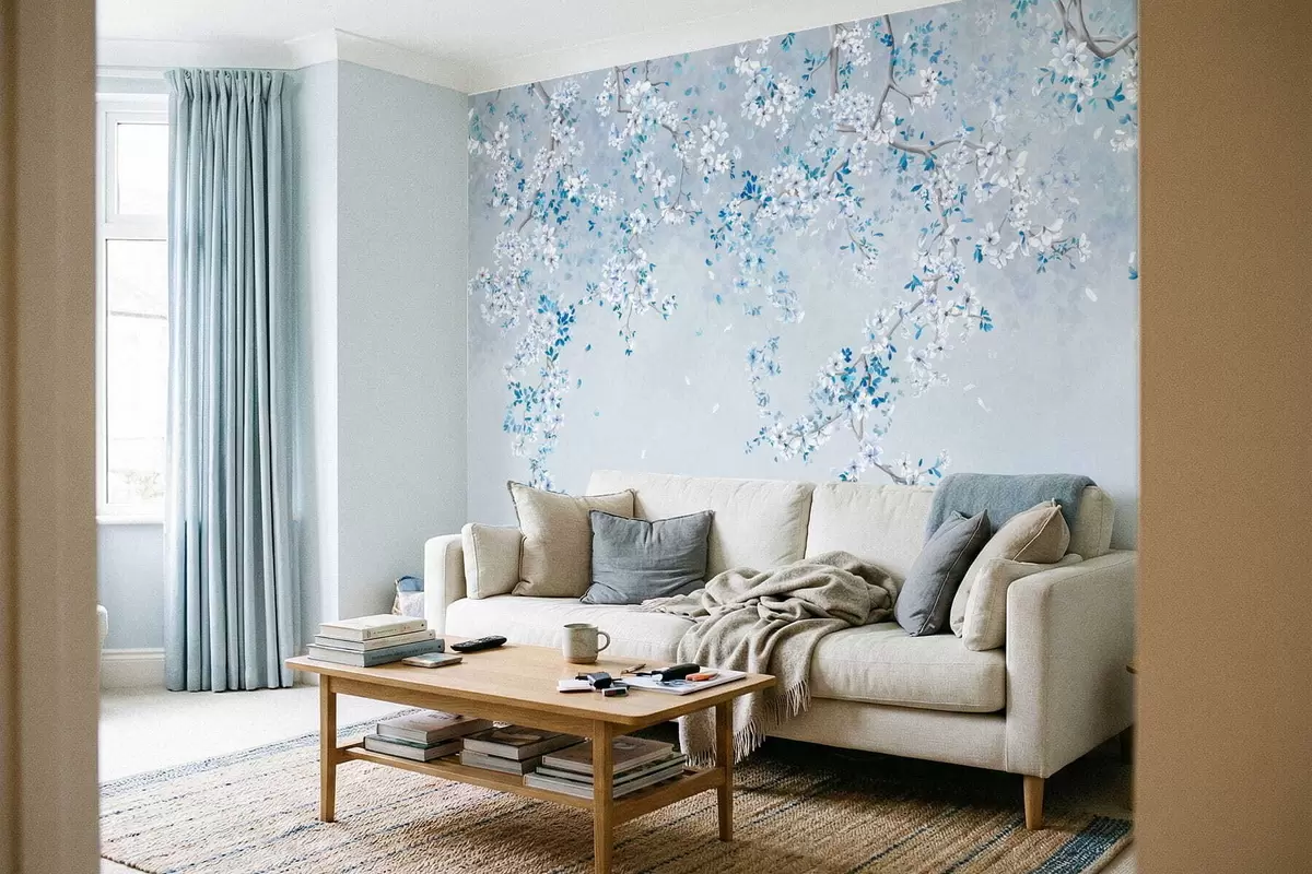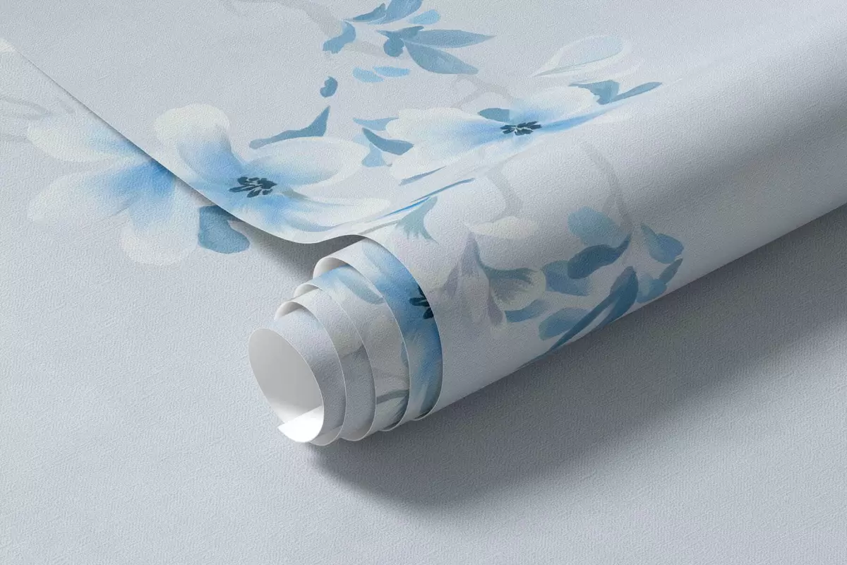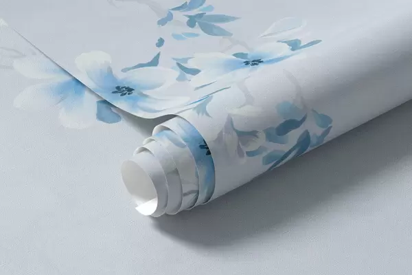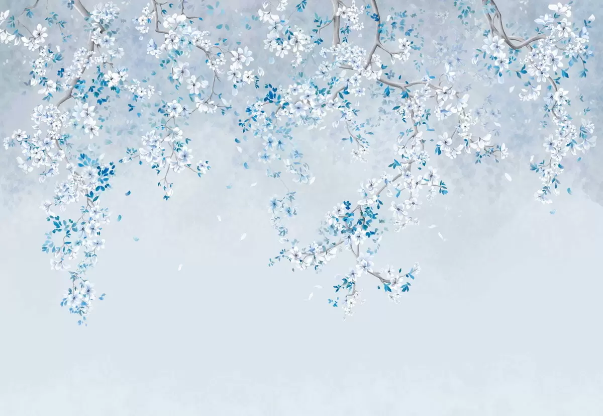 Zidne murale Grane s bijelim i plavim cvjetovima na hladnoj pozadini br. w05129v2