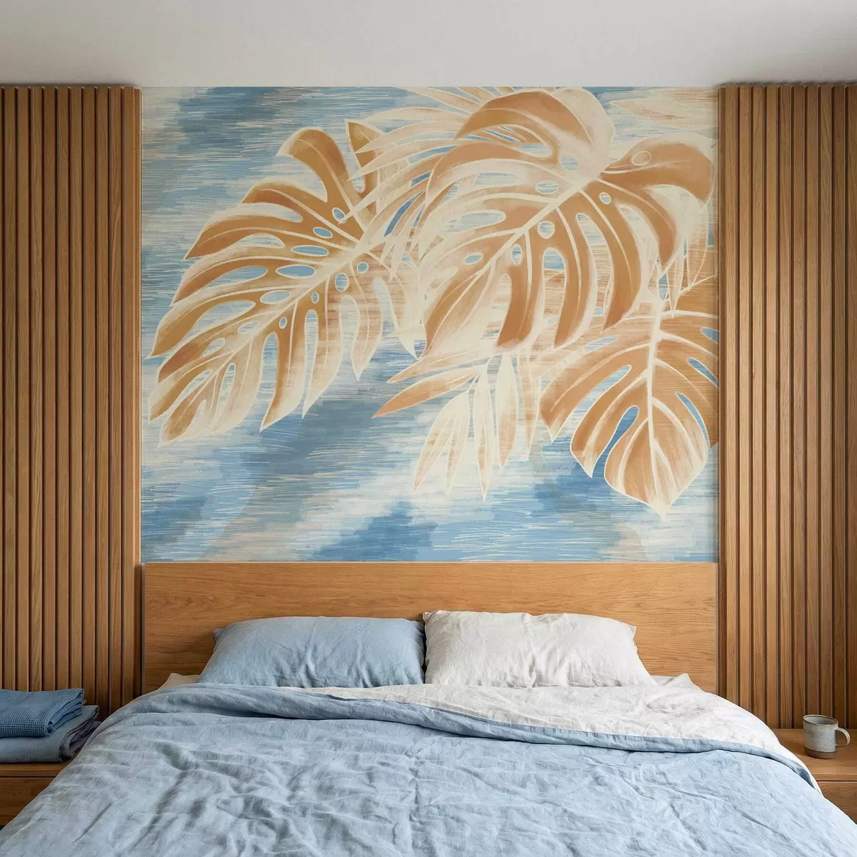 Zidne murale Lišće u svijetlim pješčanim tonovima na plavoj pozadini br. w05130v1
