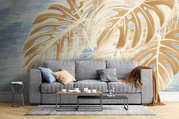 Zidne murale Lišće u svijetlim pješčanim tonovima na plavoj pozadini br. w05130v1