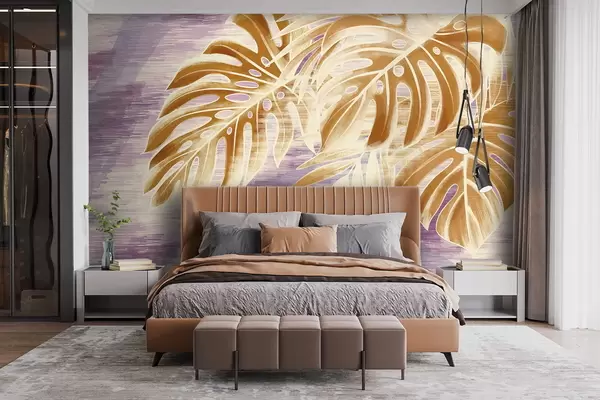 Zidne murale Lišće u toplim narančastim tonovima na ljubičastoj pozadini br. w05130v2
