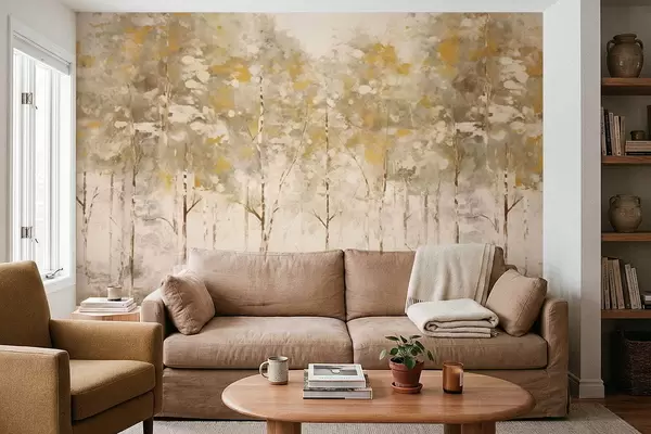 zidne murale Stilizirana šuma s vitkim drvećem u toplim tonovima w05221