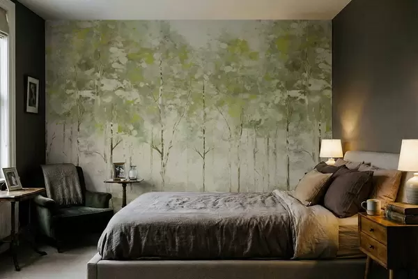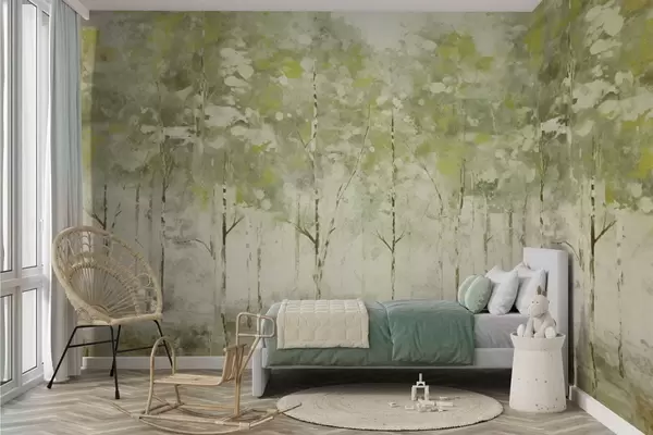 Zidne murale Stilizirana šuma s vitkim drvećem u zelenim tonovima br. w05221v1