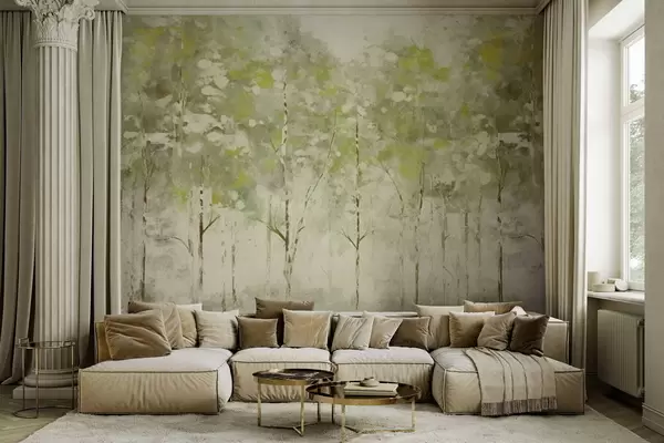 Zidne murale Stilizirana šuma s vitkim drvećem u zelenim tonovima br. w05221v1