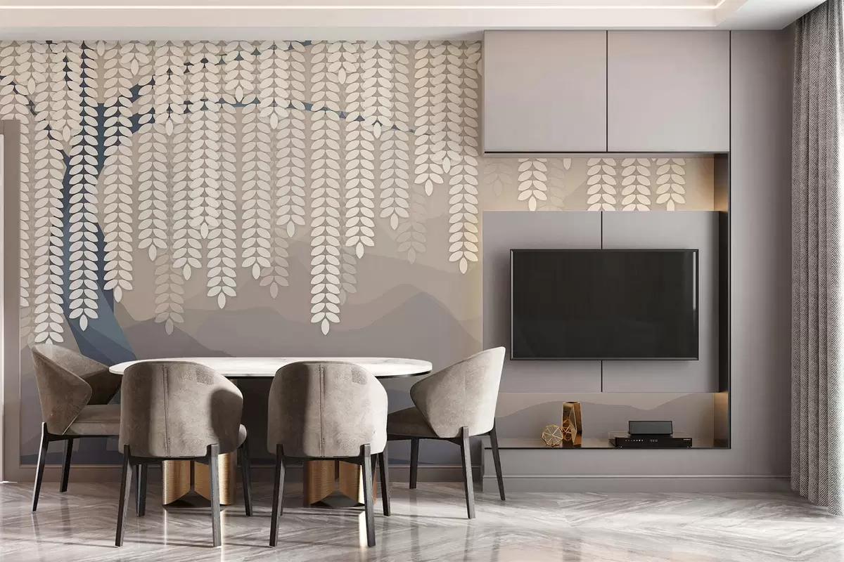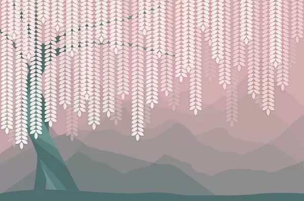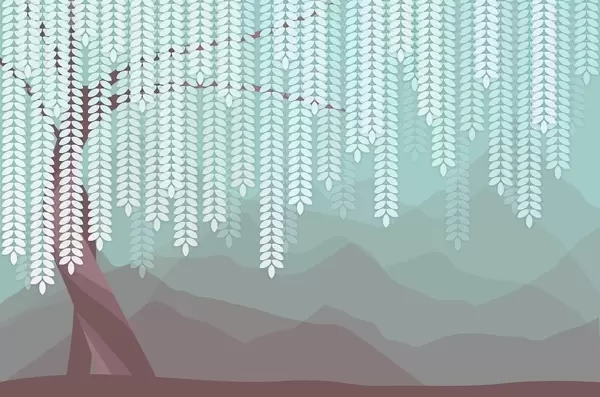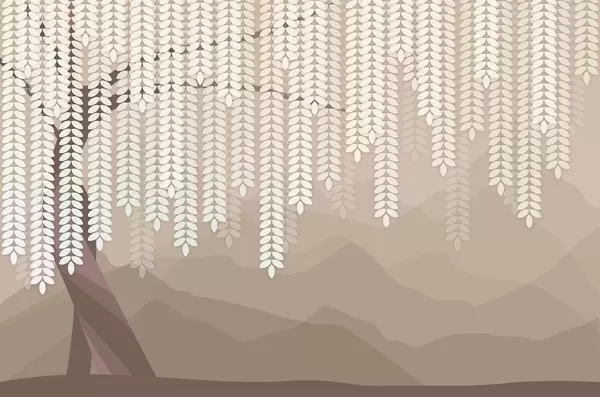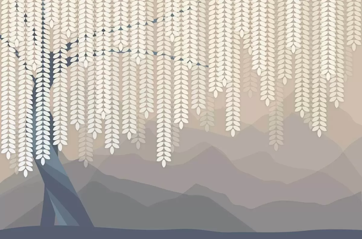Zidne murale stilizirana vrba s visećim lišćem na pozadini minimalističkih planina u nijansama bež i plavozelene br. w05232