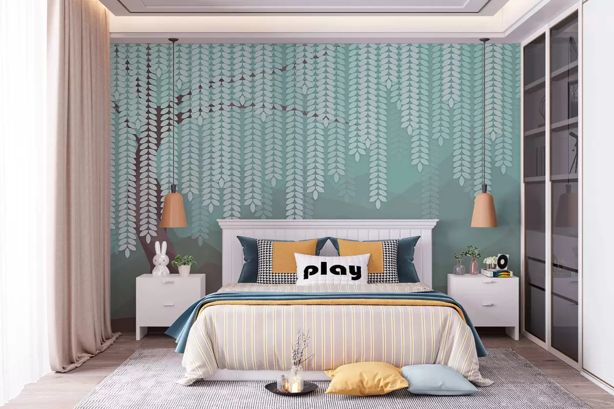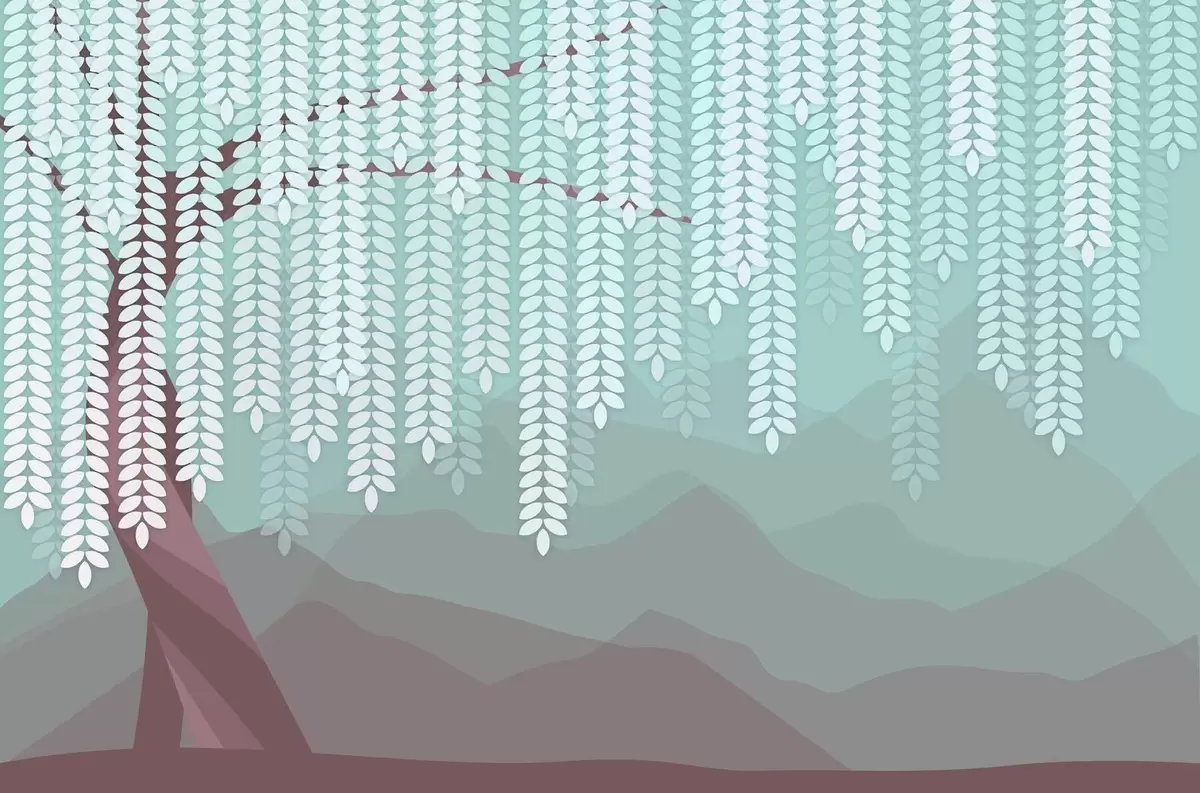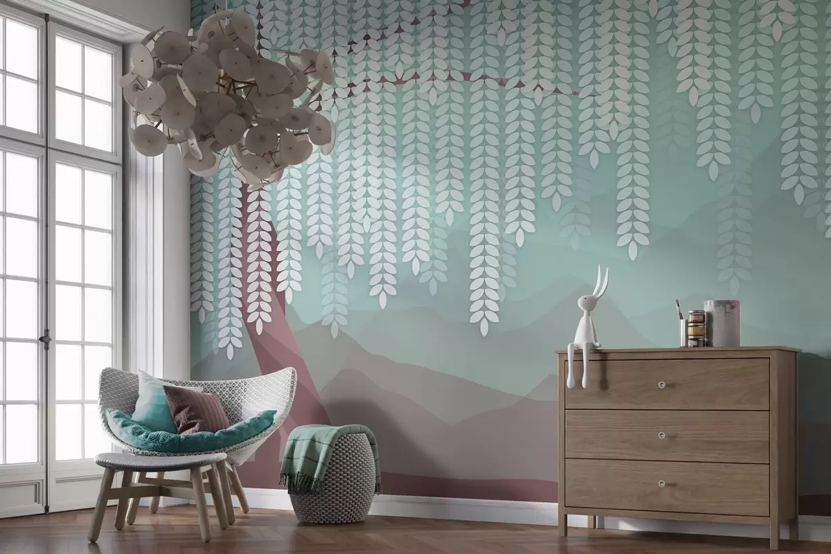 Zidne murale stilizirana vrba s visećim lišćem na pozadini minimalističkih planina u nijansama čokolade i tirkizne boje br. w05232v1