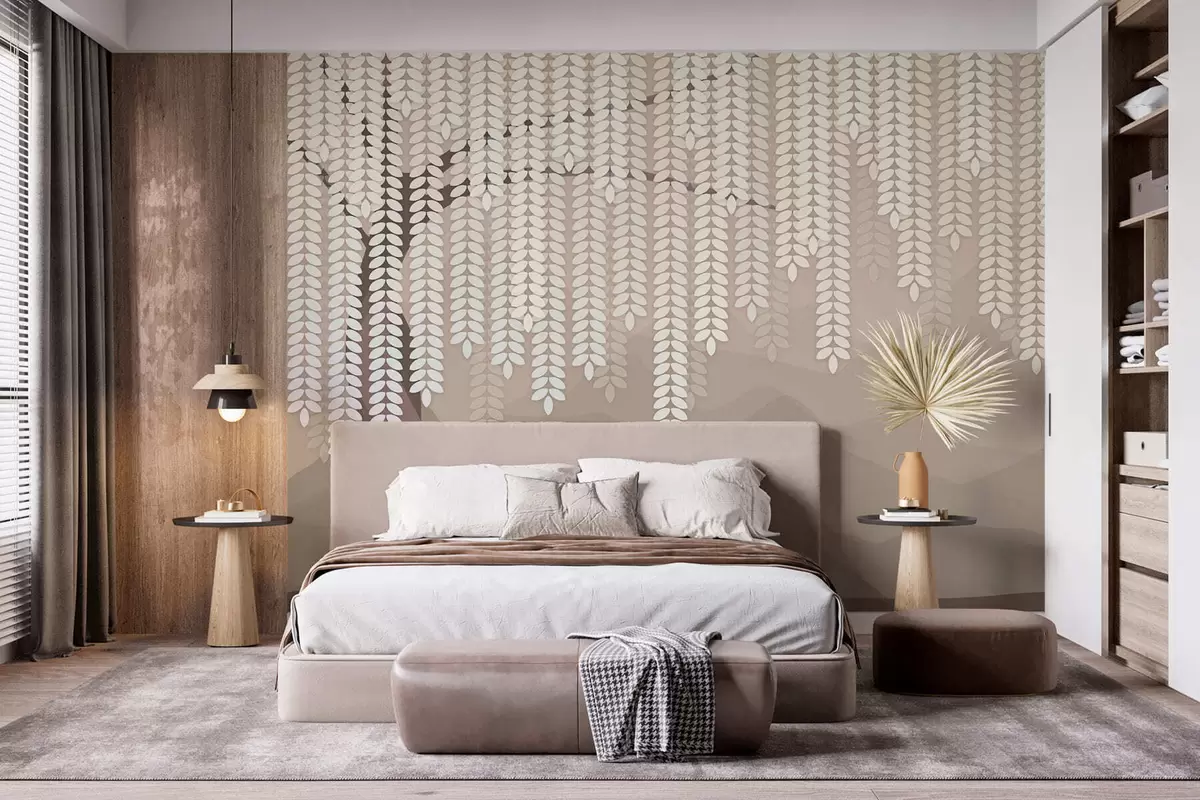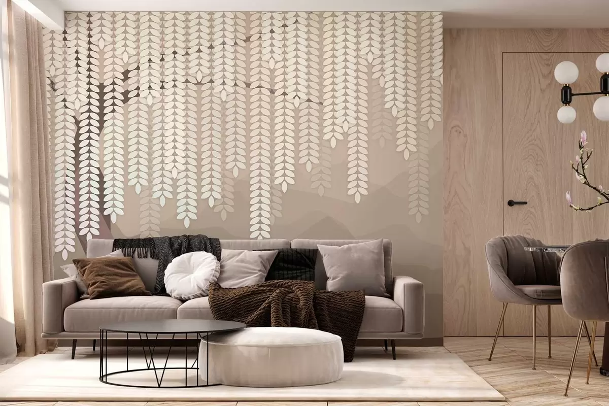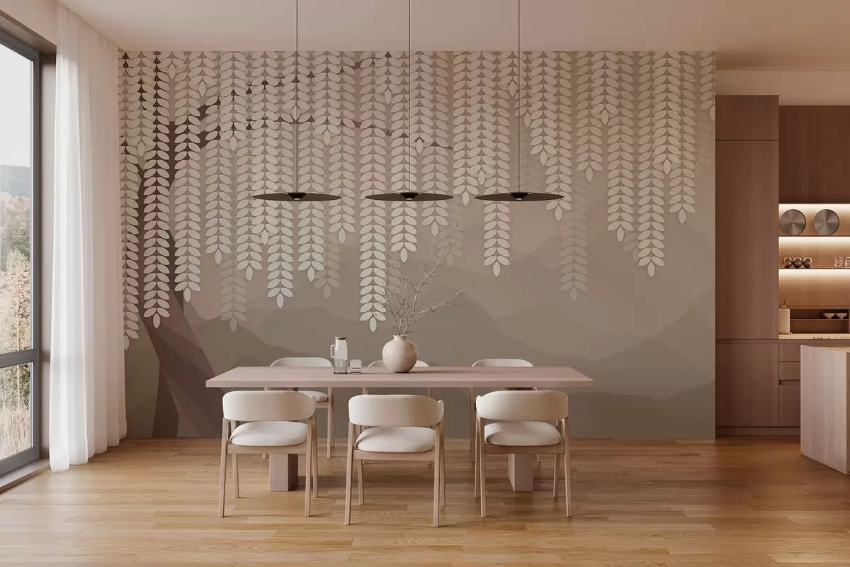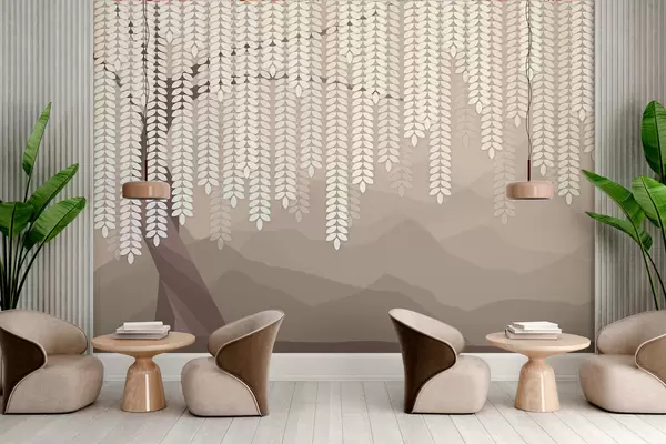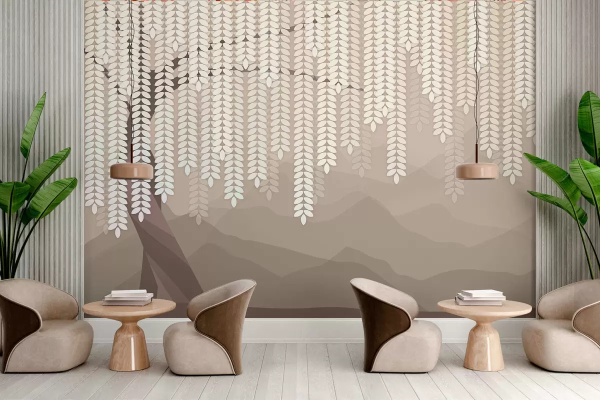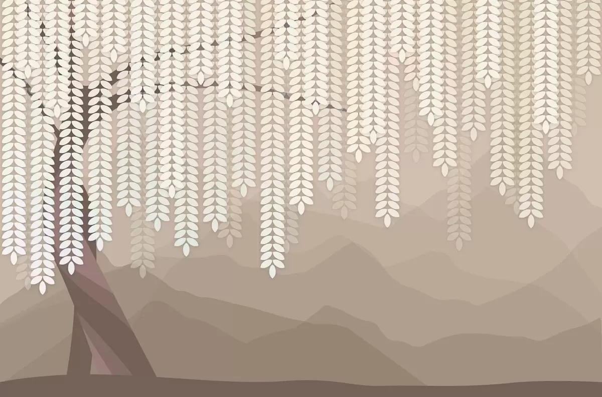 Zidne murale stilizirana vrba s visećim lišćem na pozadini minimalističkih planina u nijansama kave br. w05232v2