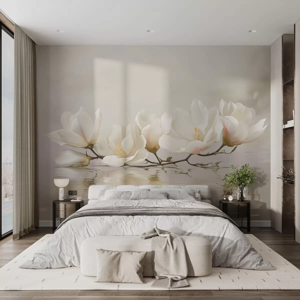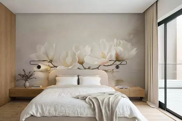 zidne murale Svijetli cvjetovi magnolije na grani iznad odraza u vodi w05353