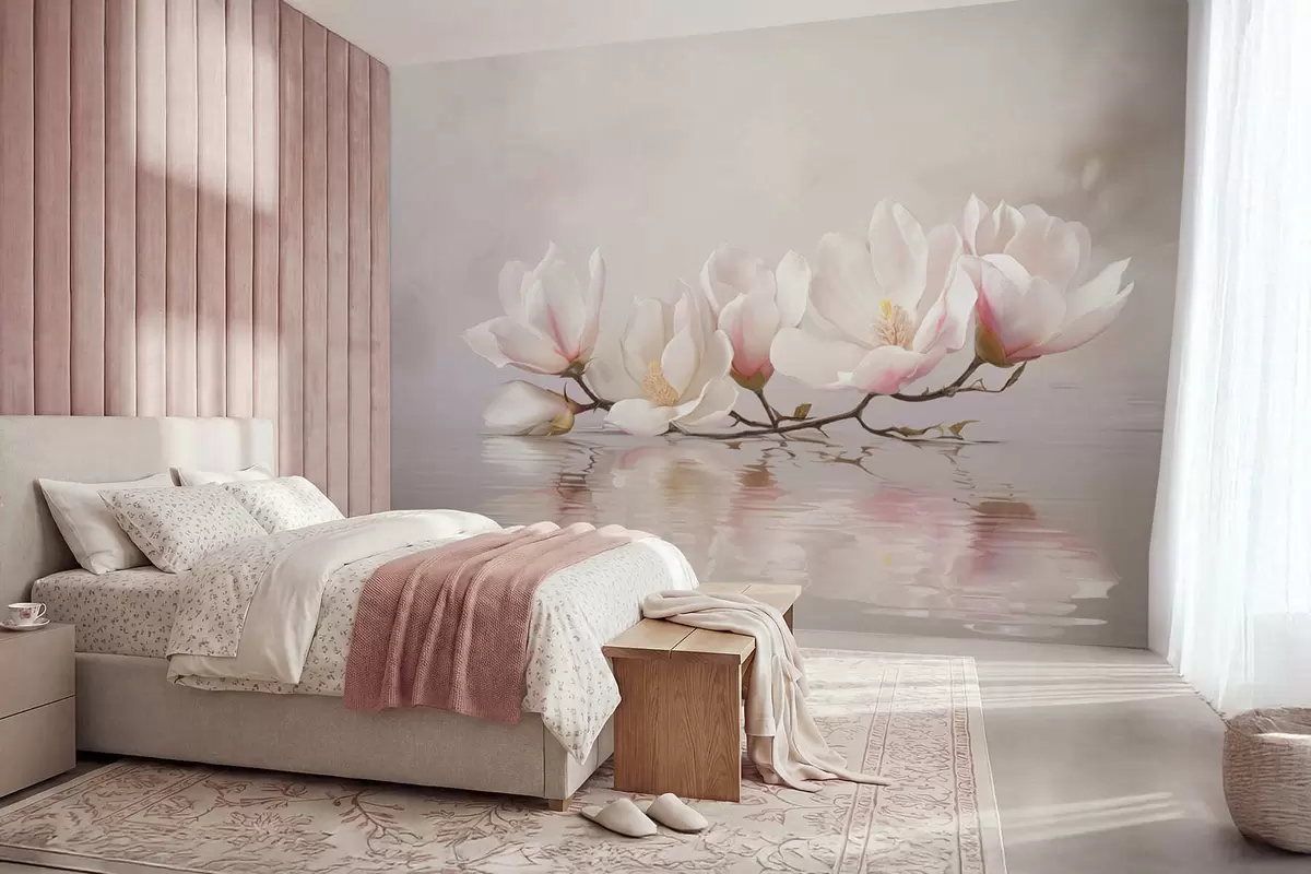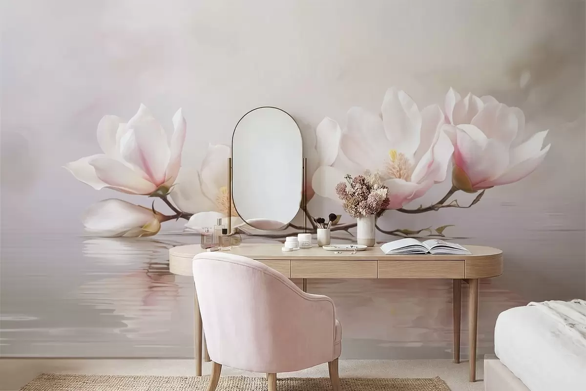 Zidne murale Grana magnolije s cvjetovima iznad odraza u mirnoj vodi br. w05353v1