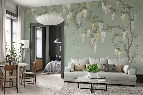 Zidne murale Cvjetne grane s bijelim cvjetovima i pticama na zelenom br. w05394