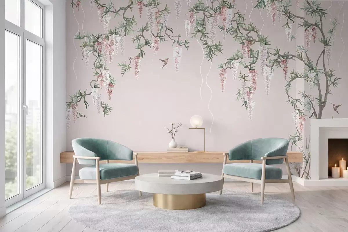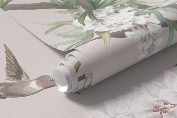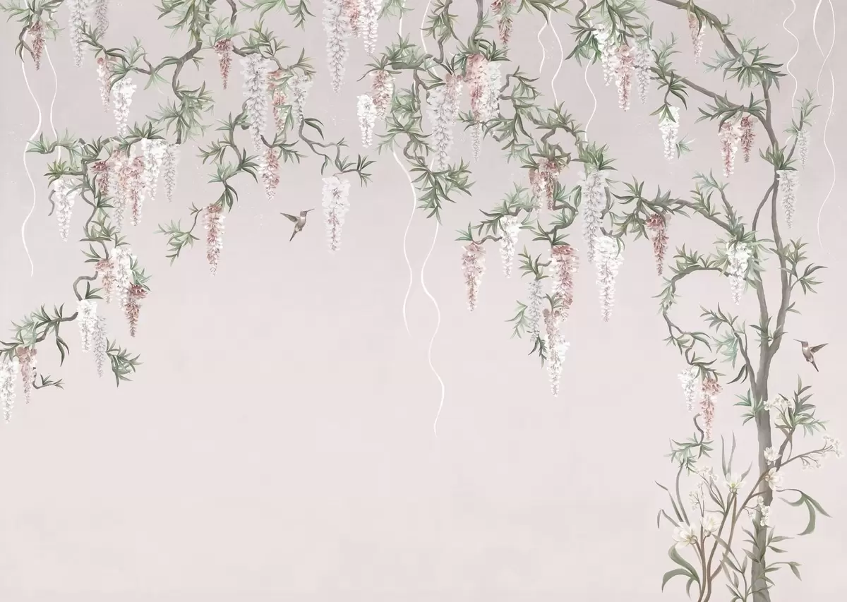 Zidne murale Cvjetne grane s ružičastim cvjetovima i pticama br. w05394v1