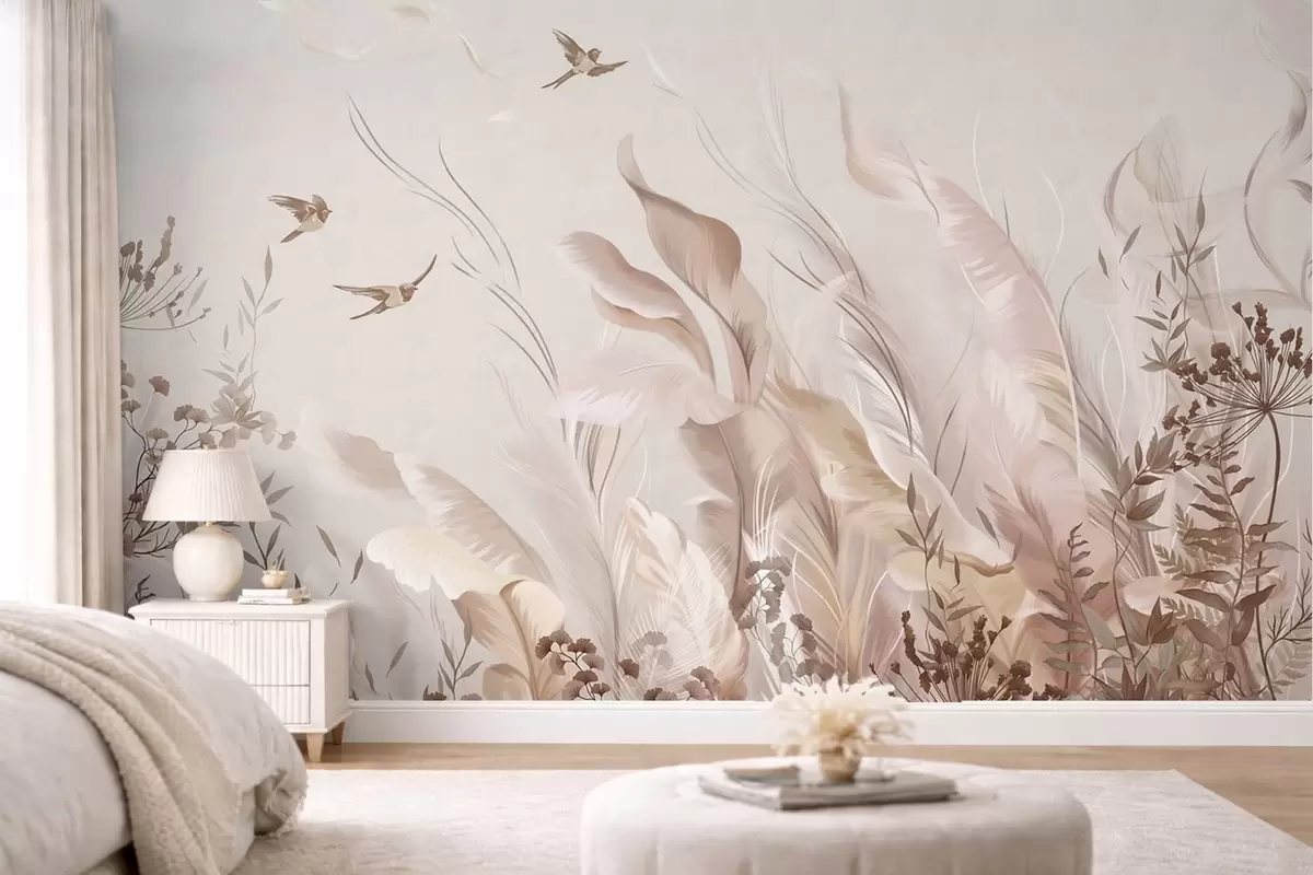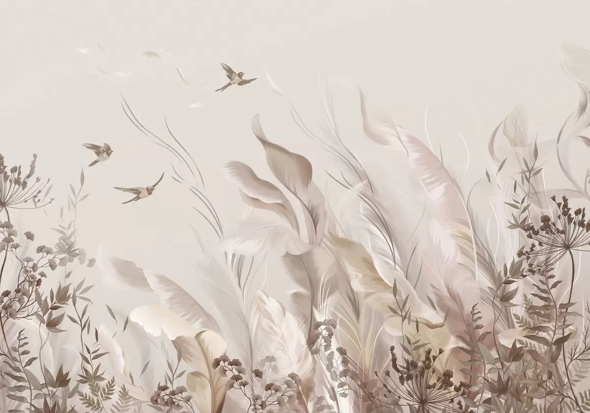Zidne murale Meko perje, trave i ptice u svijetlim tonovima br. w05395