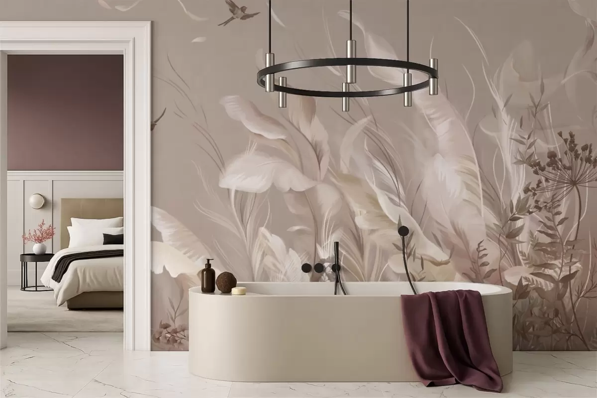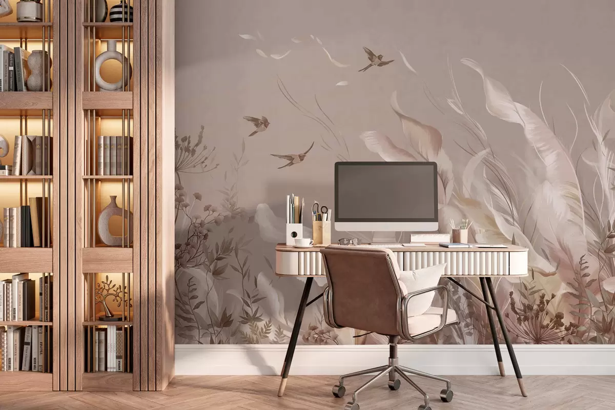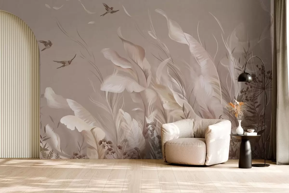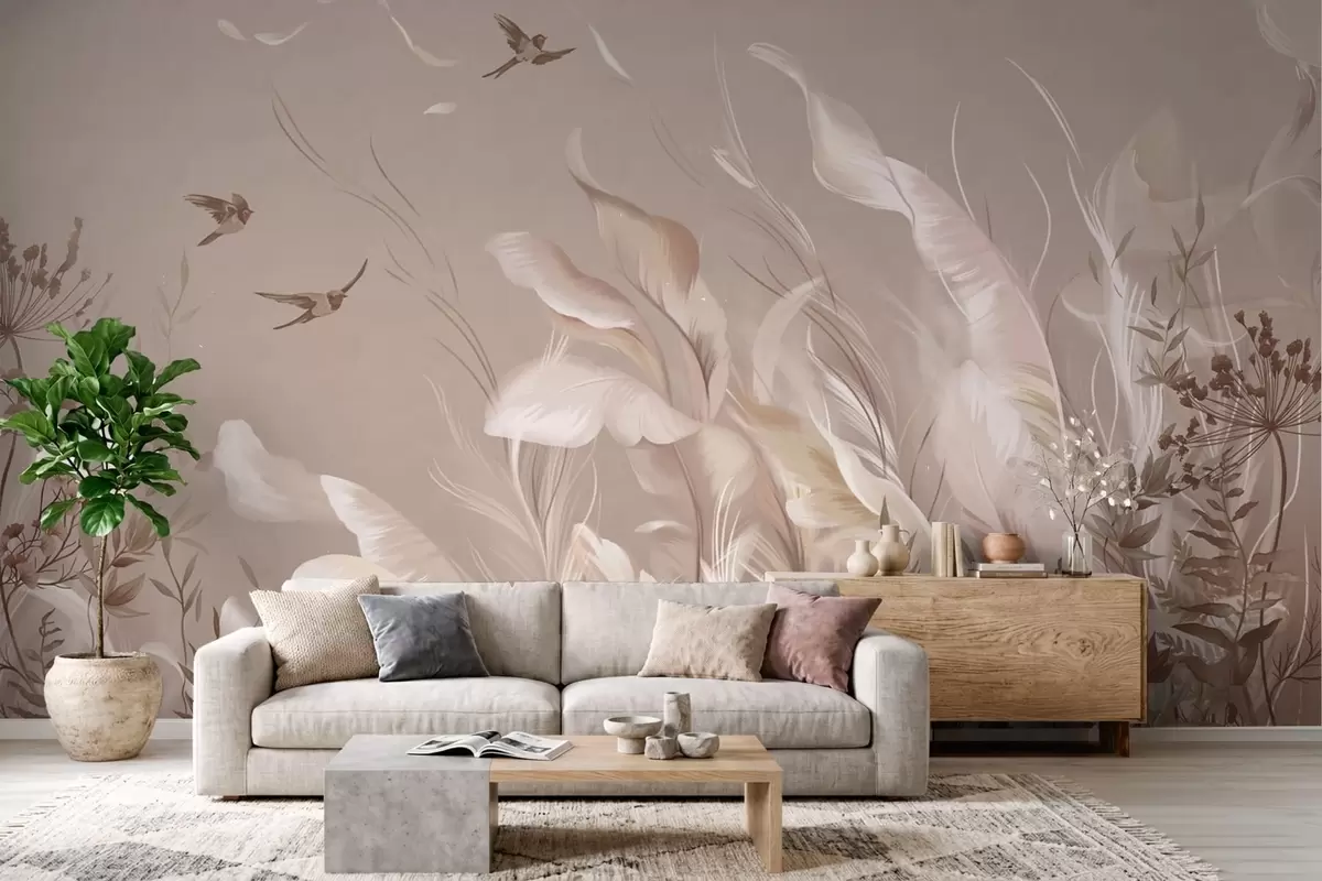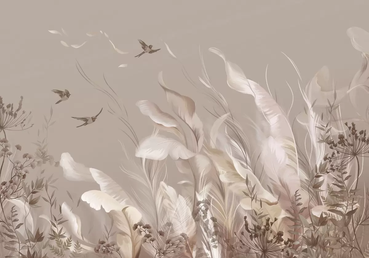 Zidne murale Svijetlo perje i biljke s pticama u pastelnim tonovima br. w05395v1