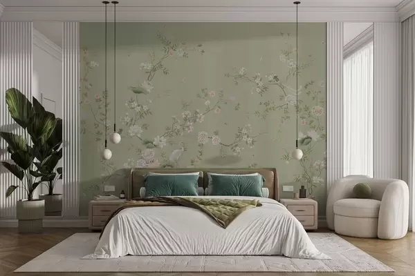 Zidne murale Cvjetne grane s pticama na svijetlozelenoj boji br. w05416