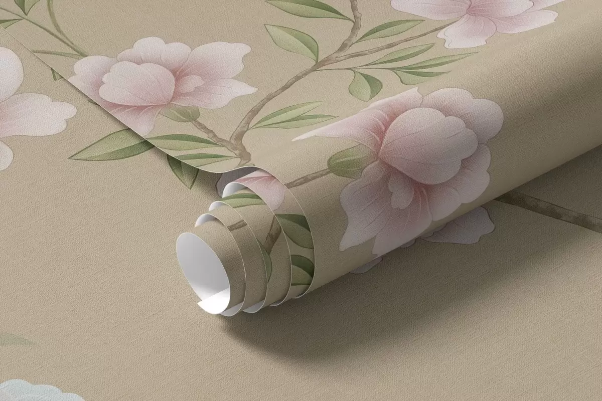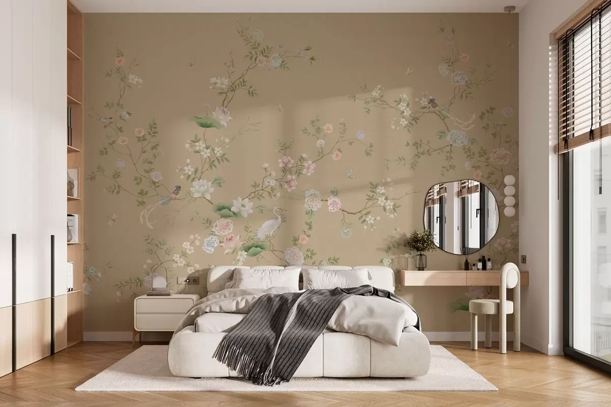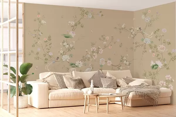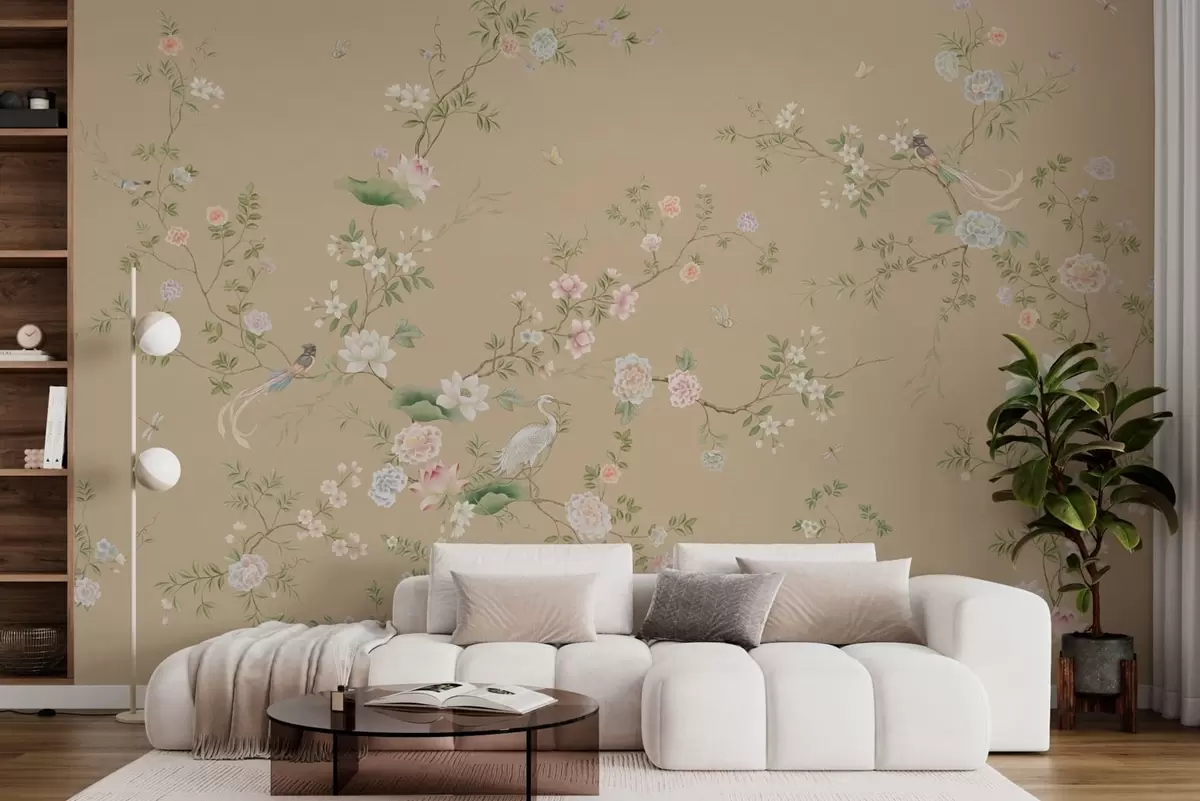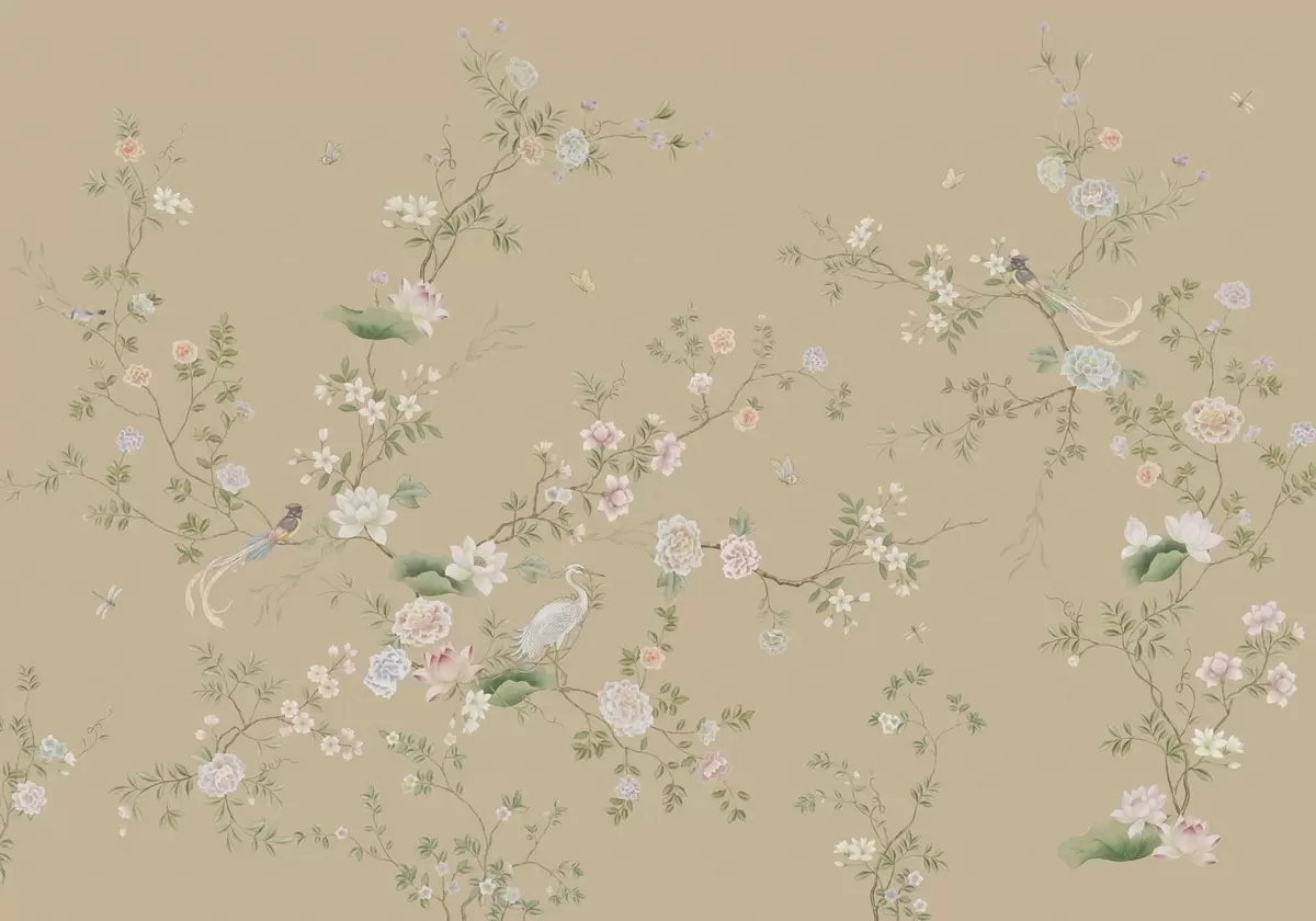 Zidne murale Cvjetne grane s pticama na toploj bež boji br. w05416v2