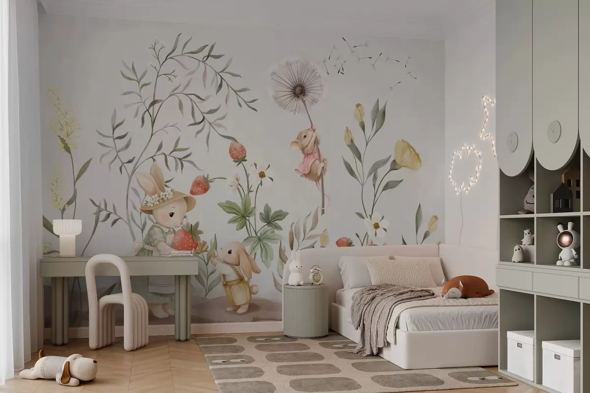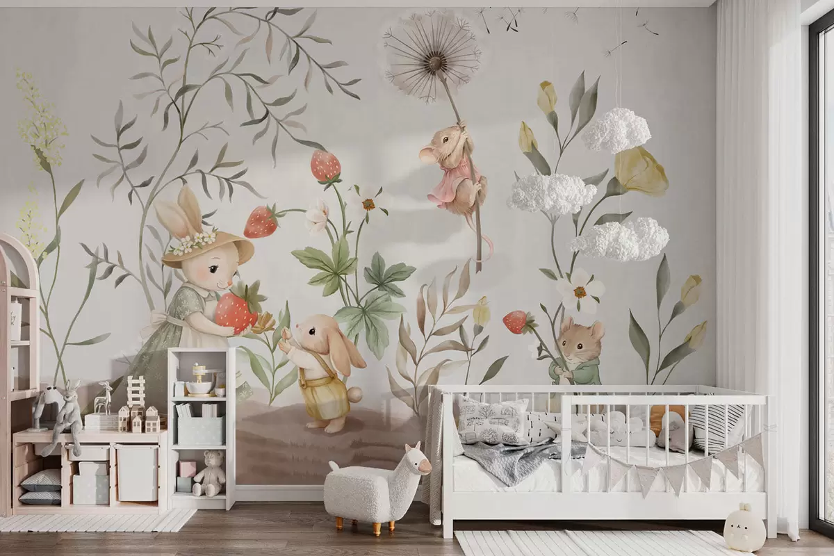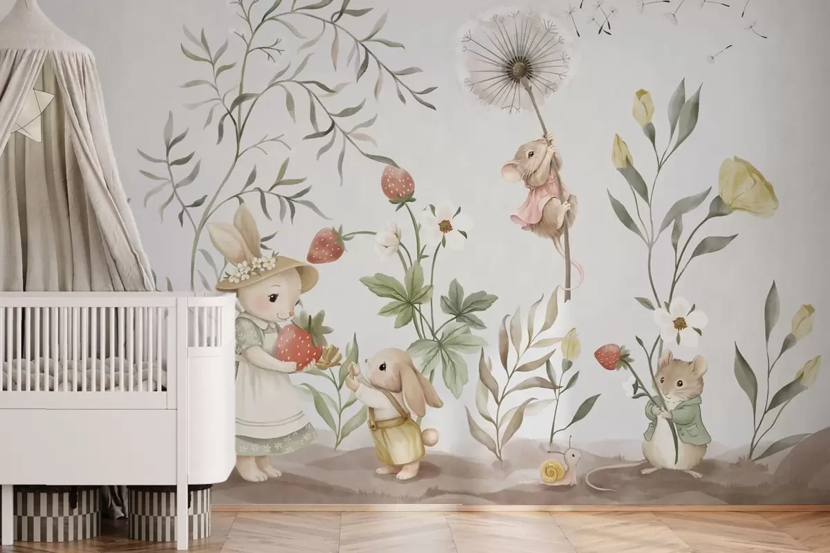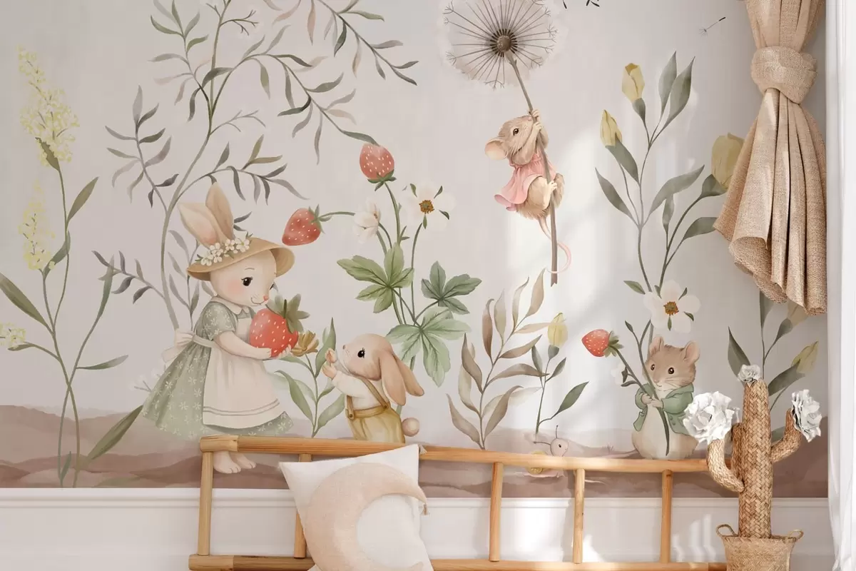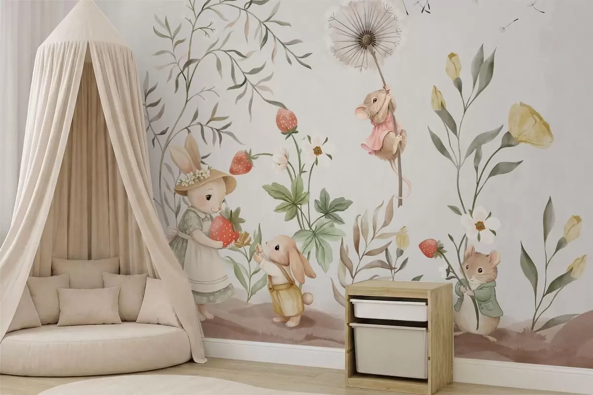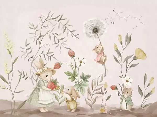 Zidne murale Dječja ilustracija zeca i miša među biljkama i cvijećem br. w05422