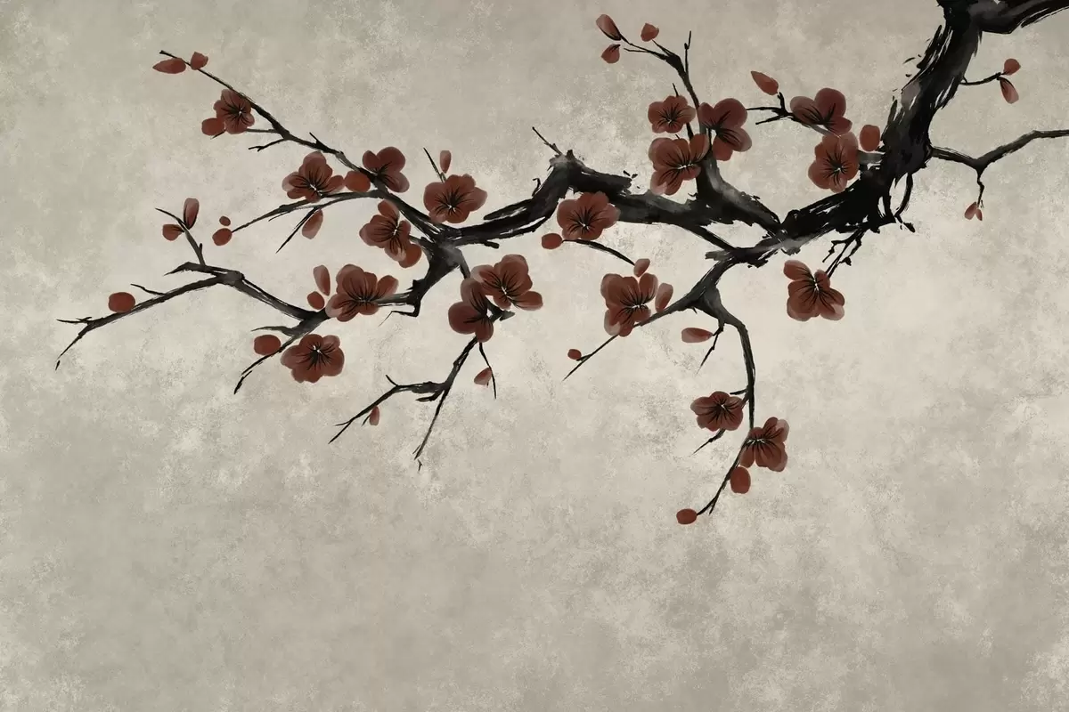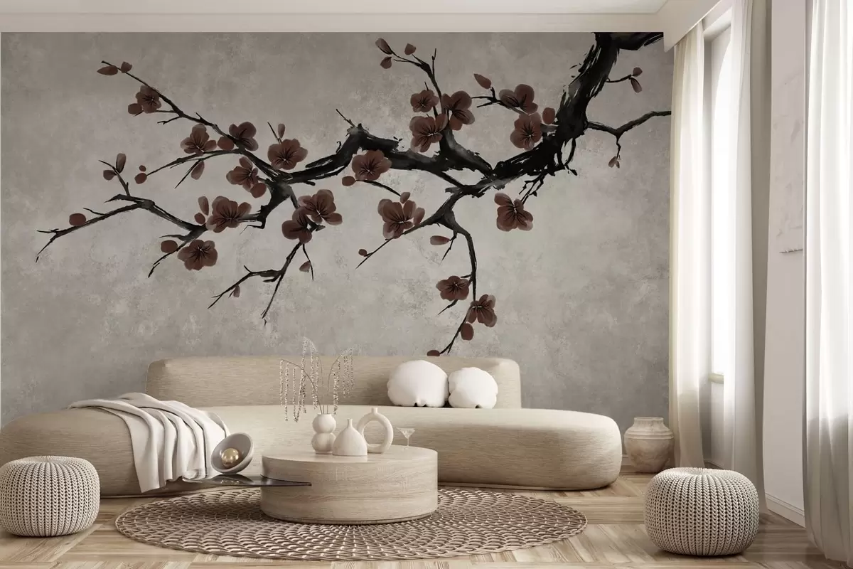 Zidne murale Grana s tamnocrvenim cvjetovima na neutralnoj pozadini br. w05425v1