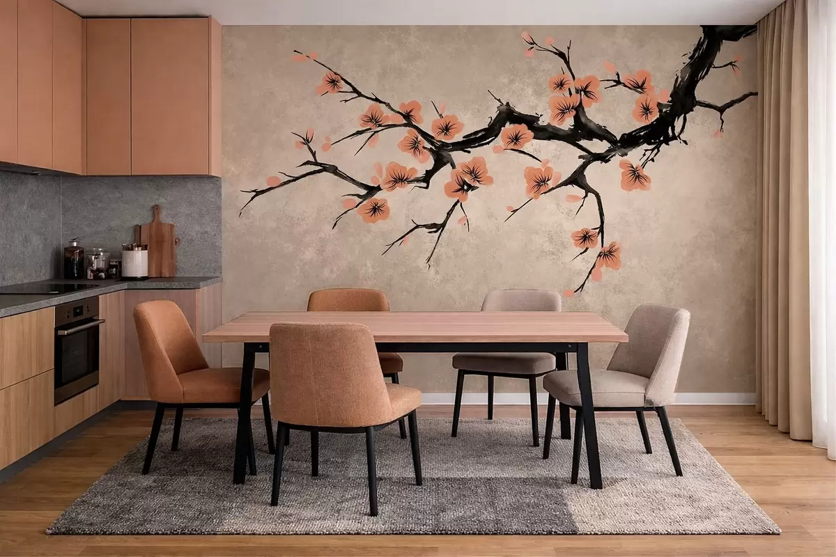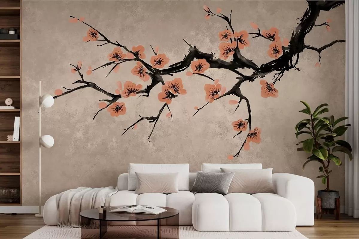 Zidne murale Grana s cvjetovima breskve na teksturiranoj pozadini br. w05425v3