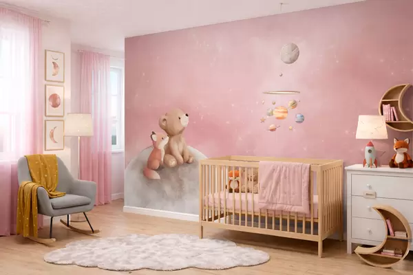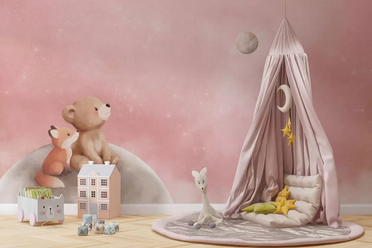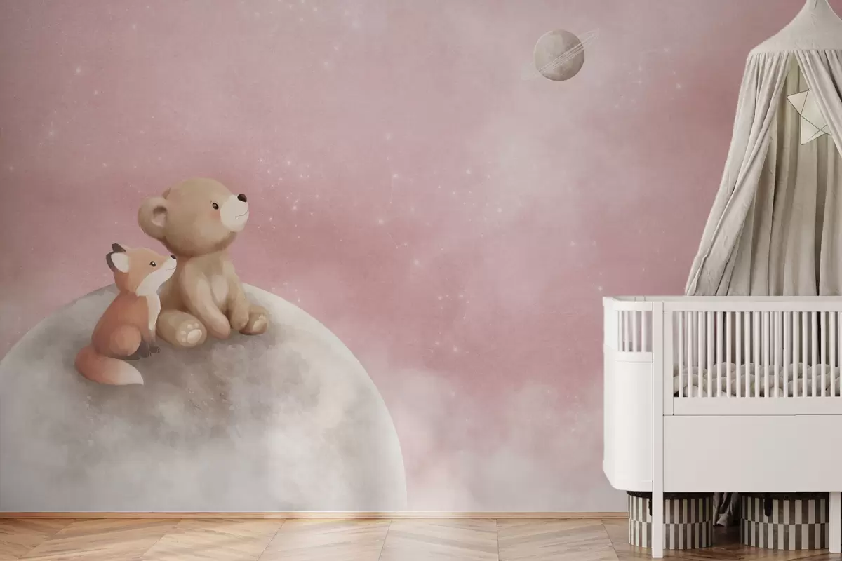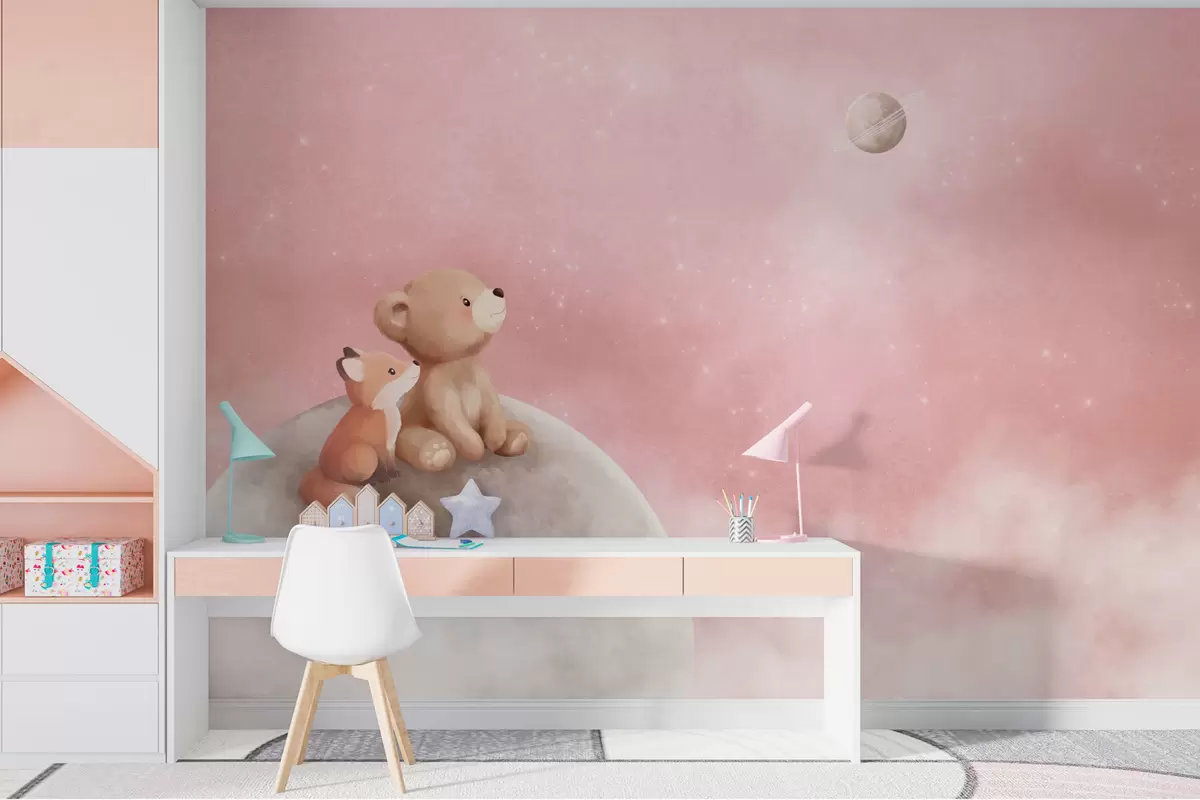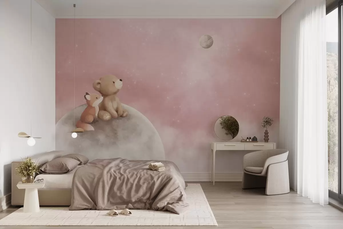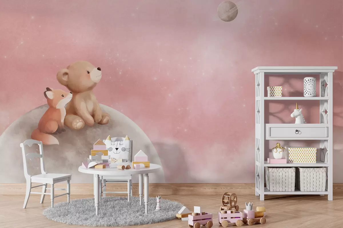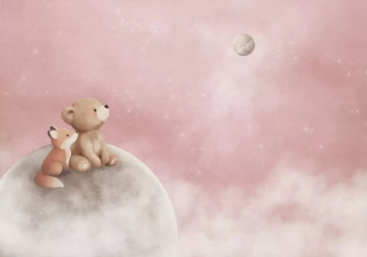 Zidne murale Pastelna ilustracija medvjeda i lisice na mjesečevom ružičastom nebu br. w05431v2