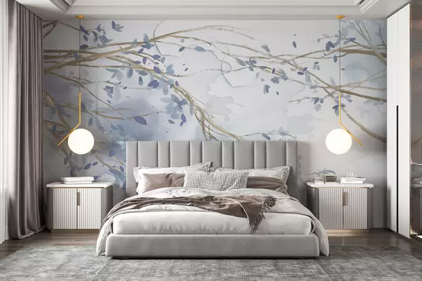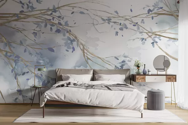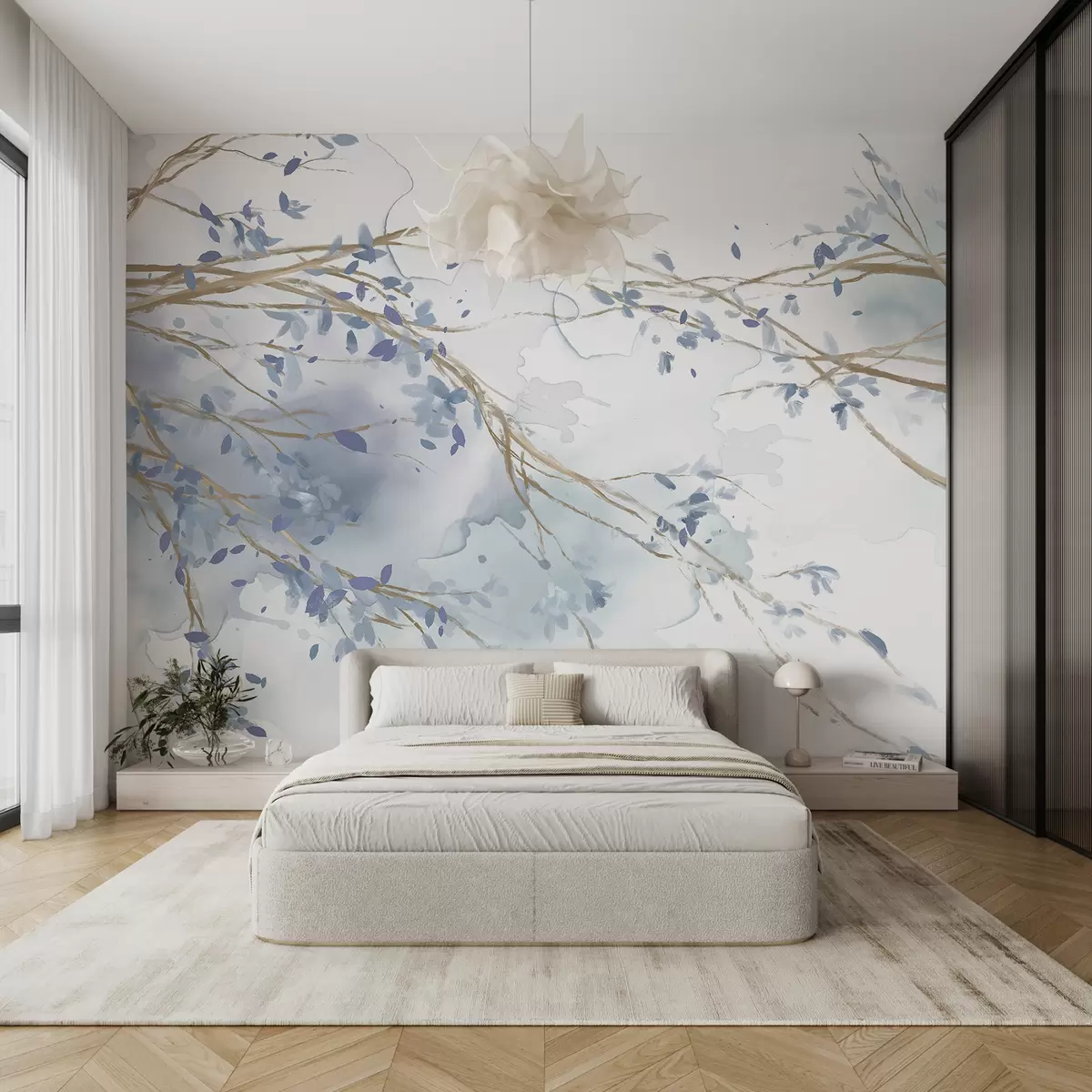 Zidne murale Nježne plavo-bijele cvjetne grane s mekom, zamućenom akvarelnom pozadinom br. w07919