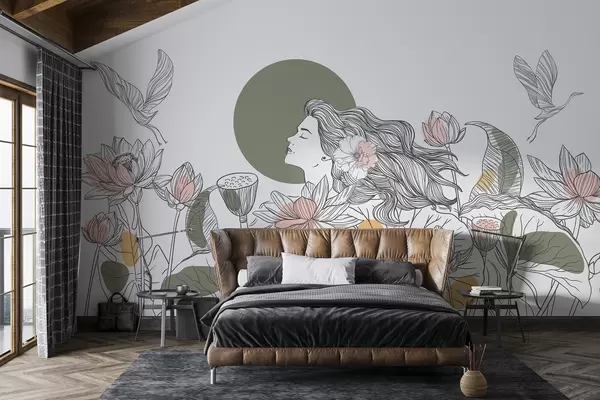 Zidne murale Žena u prirodi, crtanje linija, lotosovo cvijeće, veliko lišće, ptice koje lete, pastelne boje br. w07988v6
