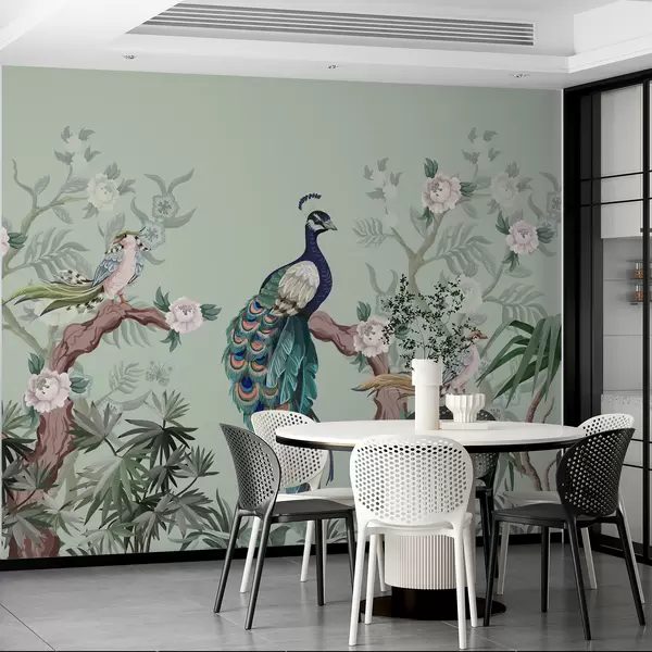 Zidne murale paun na drvetu, zelena pozadina br. w08168v1