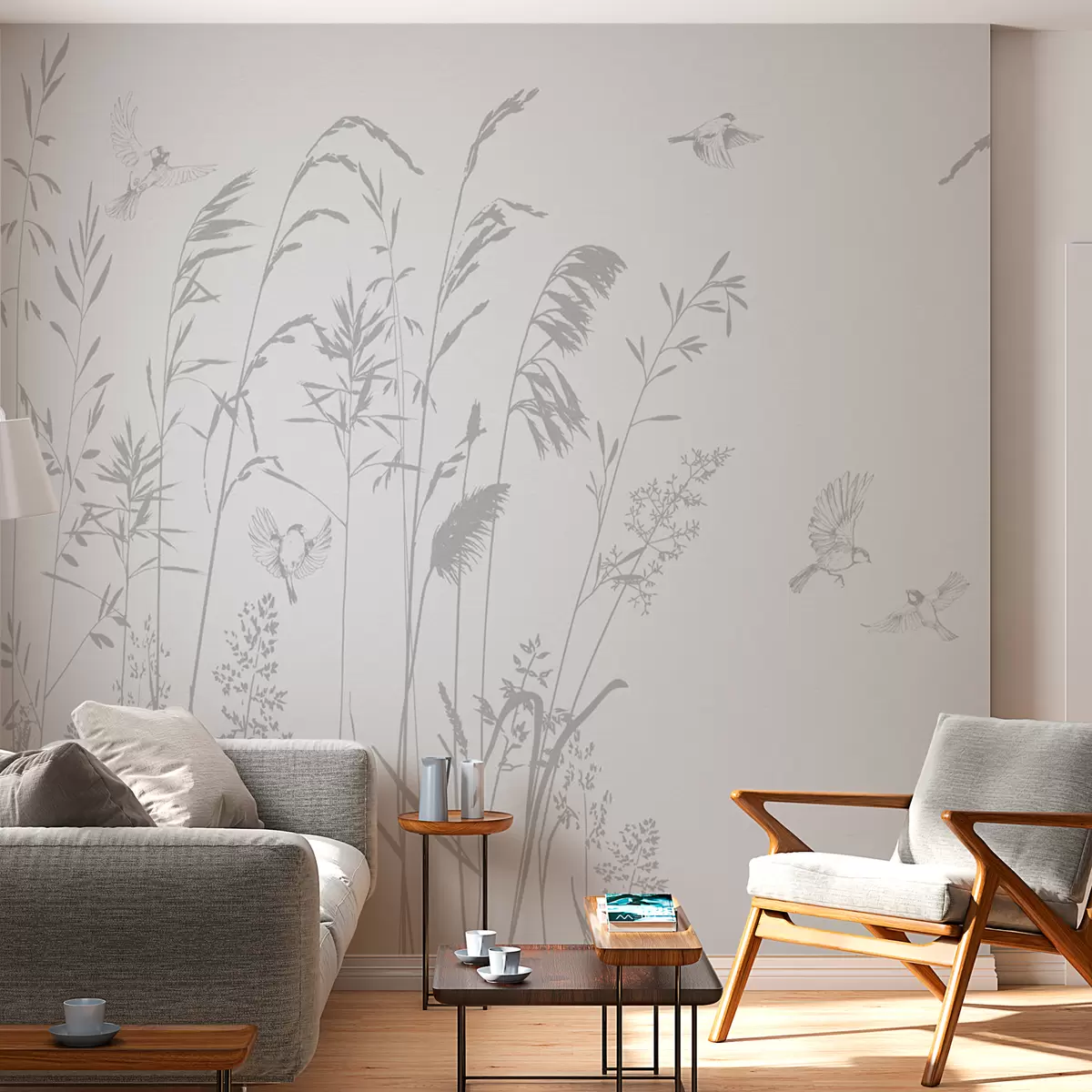 Zidne murale Biljke i male ptice priroda minimalizam siva boja br. w08172v1