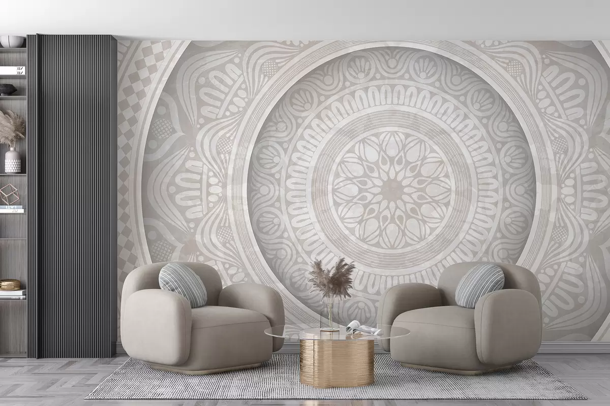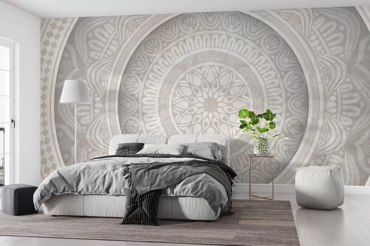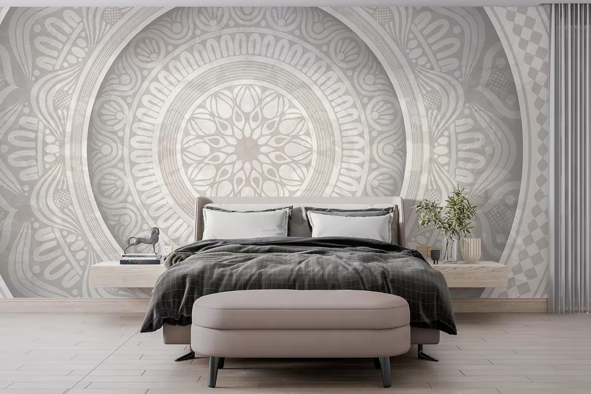 Zidne murale Detaljan simetričan sivo-bijeli otisak mandale s koncentričnim krugovima i geometrijskim oblicima br. w08182