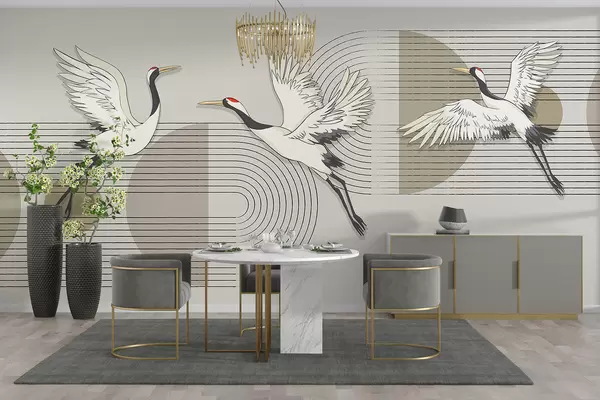 Zidne murale Tri bijela ždrala u letu na geometrijskoj minimalističkoj pozadini s koncentričnim krugovima br. w08188