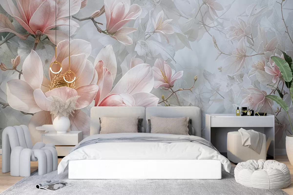 Zidne murale Nježni ružičasti cvjetovi magnolije koji cvjetaju na mekoj, zamućenoj cvjetnoj sivoj pozadini br. w08192