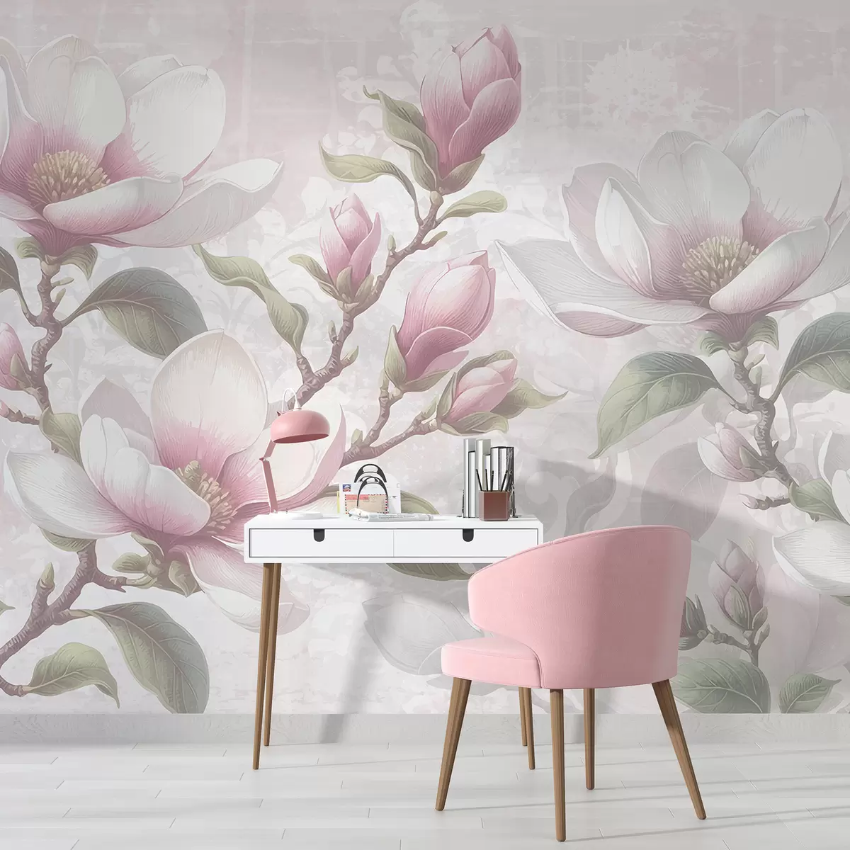 Zidne murale Nježni ružičasti cvjetovi magnolije u punom cvatu na mekoj, zamućenoj pozadini br. w08216