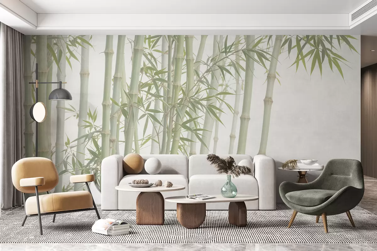 Zidne murale Gusta bambusova šuma s visokim bambusovim stabljikama i zelenim lišćem na mekoj, maglovitoj pozadini br. w08237