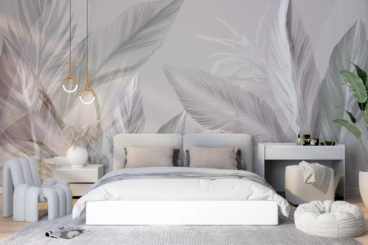Zidne murale Nježno bijelo, ružičasto i sivo perje i tropsko lišće lebdi na svijetloj pozadini br. w08241v1