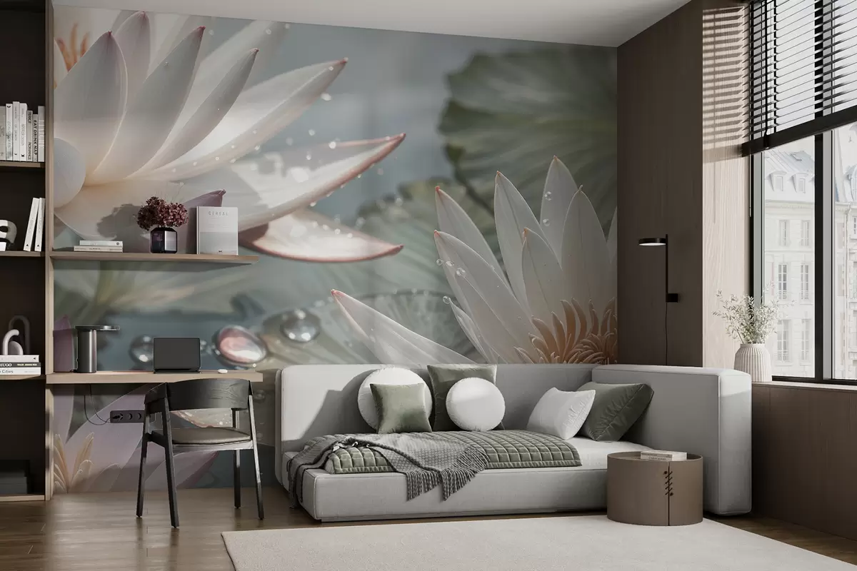 Zidne murale Krupni plan bijelih lotosovih cvjetova s kapljicama vode na laticama na zamućenoj zelenoj pozadini br. w08252