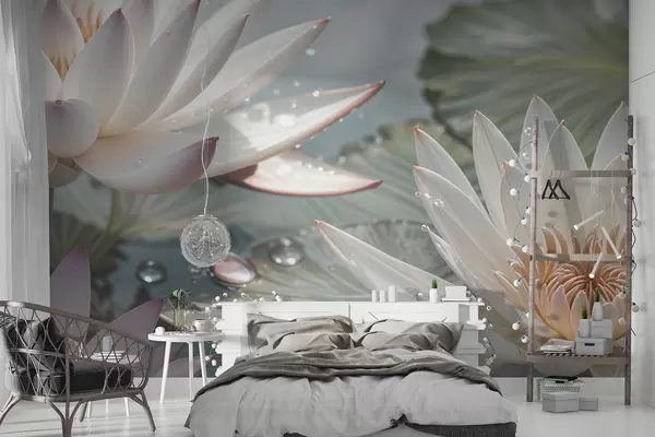 Zidne murale Krupni plan bijelih lotosovih cvjetova s kapljicama vode na laticama na zamućenoj zelenoj pozadini br. w08252